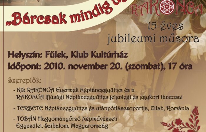A Rakonca Néptáncegyüttes 15 éves jubileumi műsora, 2010. november 20-án, szombaton, 17.00 órakor a Füleki Klub Kultúrházban.