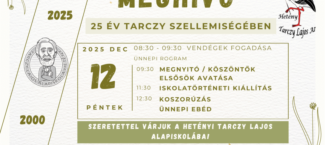 Tisztelt Támogatóink, Partnereink, Kedves Barátaink! Szeretettel és tisztelettel hívjuk Önöket a Tarczy Lajos Alapiskola ünnepségére, amelyet a magyar oktatás újjáalakulásának 75. évfordulója és iskolánk névadásának 25. évfordulója alkalmából rendezünk. Az ünnepség […]