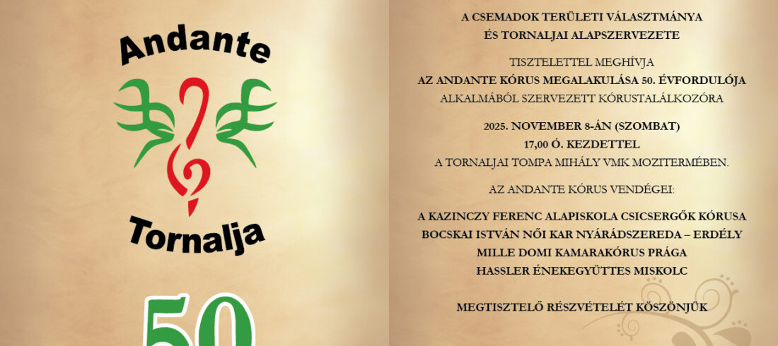 A Csemadok Területi Választmánya és Tornaljai Alapszervezete tisztelettel meghívja Önt az Andante Kórus megalakulásának 50. évfordulója alkalmából szervezett kórustalálkozóra, Időpont: 2025. november 8., szombat, 17:00 óraHelyszín: Tornaljai Tompa Mihály VMK […]