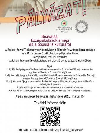 Babeș–Bolyai Tudományegyetem Magyar Néprajz és Antropológia Intézete és a Kriza János Szakkollégium pályázatot hirdet középiskolai tanulók számára az iskolai hagyományok...