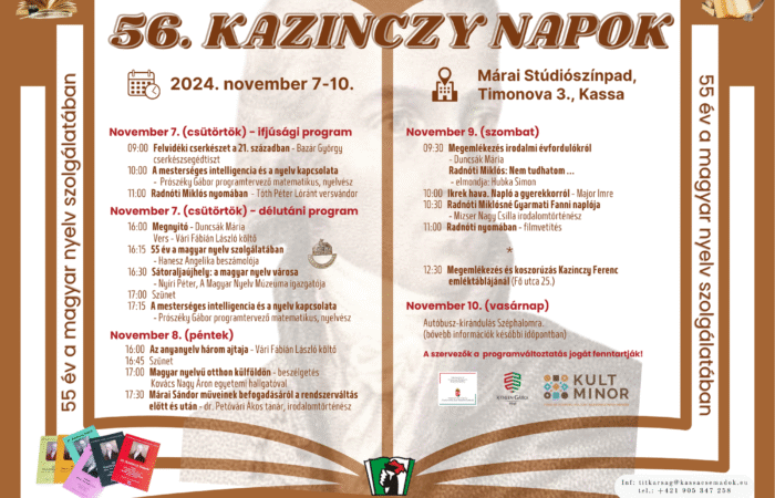 A Csemadok Kassai Városi Választmánya immár 56. alkalommal rendezi meg a Kazinczy Napokat Kassán. A rendezvénysorozat ez évi témája: „55 év a...
