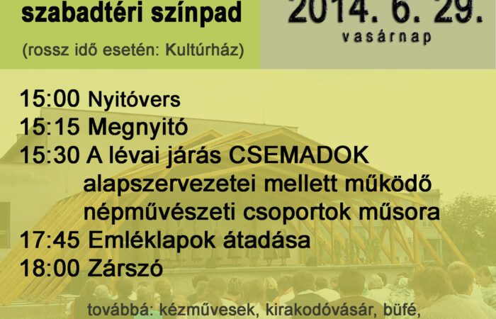 Daloló Ipolyvölgye – Járási Dal- és Táncünnepély 15:00 Nyitóvers 15:15 Megnyitó 15:30 A lévai járás CSEMADOK alapszervezetei mellett működő népművészeti...