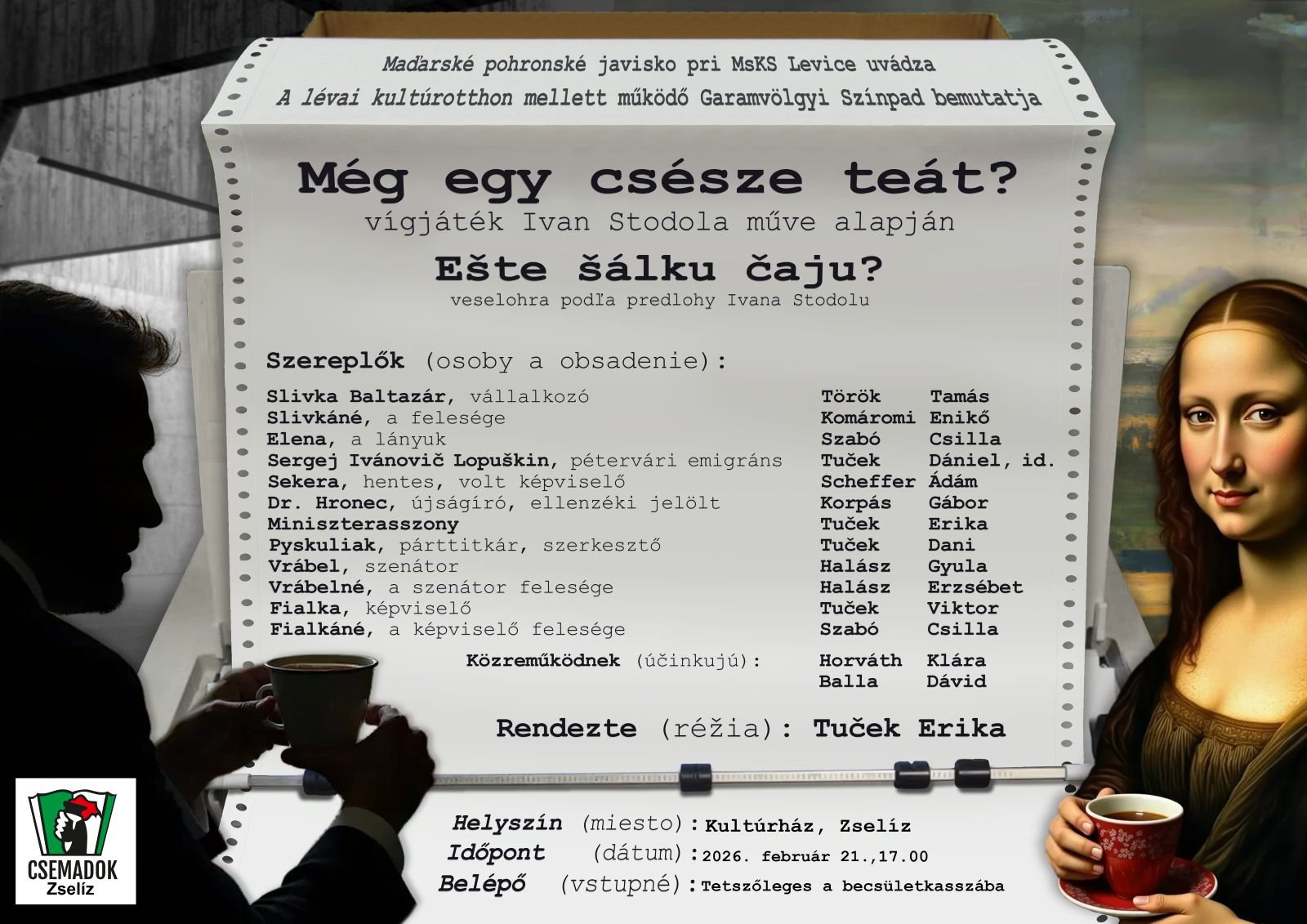 Az első este igazi meglepetése „A nagy (cseh)szlovákiai magyar csönd” című előadás volt. Soóky László monodrámája Benkő Géza előadásában kelt életre, s nyűgözte le a nézőket. Csak a legnagyobb elismeréssel tudok szólni a kivételes élményt adó produkcióról, amely nem csupán az alapul szolgáló szöveg hiteles tolmácsolása révén, de a láttató erejű, kevés eszközzel dolgozó, de például tárgy-animációban is pontos színészi munka révén vált felejthetetlenné. Nagyszerű előadás volt. A benyomásokkal zsúfolt nap estéjén a házigazdák a meghívott vendégek és a zsűritagok számára nyújtottak baráti vendéglátást.