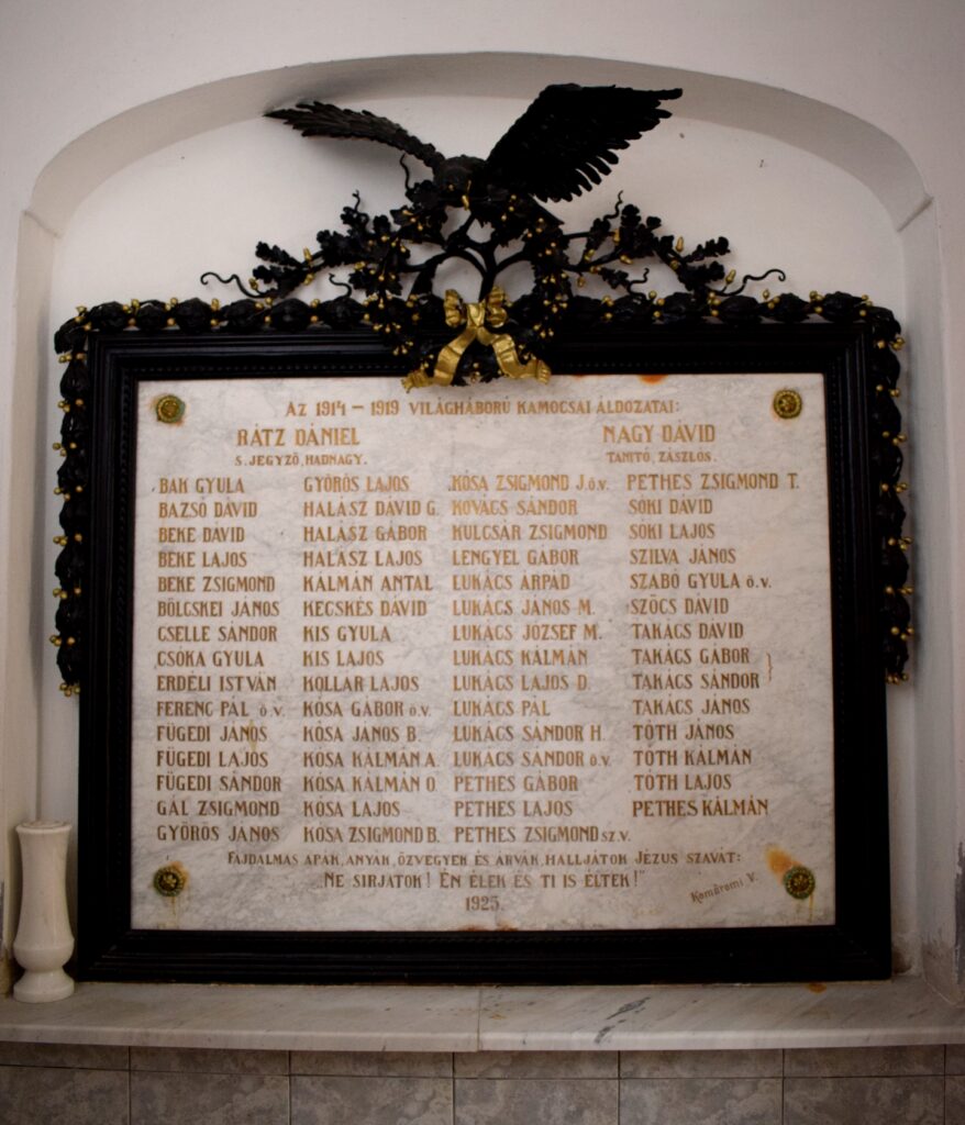 A templom belső terében három eléggé méretes táblát találunk. A torony alatti előcsarnok, úgynevezett „Kistemplom“ jobb oldali falán található emléktábla fehér carrarai márványból készült. Komáromy Viktor kőfaragó készítette, a kovácsolt vas keret Harmos Károly festőművész terve szerint készült, tölgy- és borostyánlevelekkel, felül a 61 aranyozott név fölé hatalmas kiterjesztett szárnyú turulmadár került, lehajtott fejjel babérkoszorút tart a csőrében. Az emléktábla az 1914–1919-es világháború kamocsai áldozatainak emlékét hirdeti, a gyászoló hozzátartozók adományaiból készült, és 1925. március 1-én került felszentelésre Nt. Boross Kálmán lelkipásztor által.