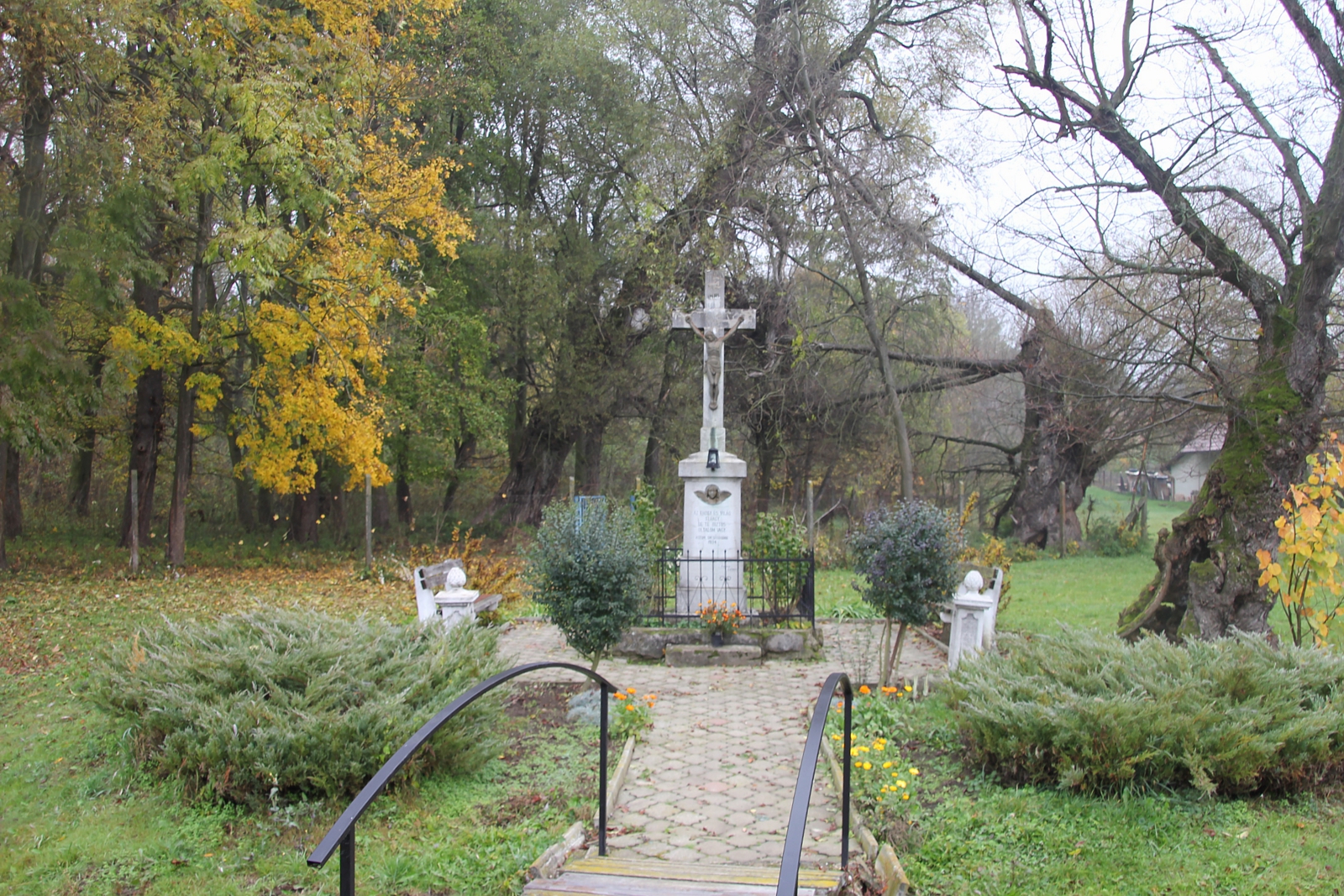 Község közepén álló keresztfa, vaskerítéssel körülvéve. Templom hiányában itt tartották a szentmiséket illetve az ünnep- és vasárnap délutáni litániákat, valamint helyet adva a lakosoknak a beszélgetésre és találkozásra. Korponai Julianna, a rózsafüzér társulat előénekese és vezetője gyűjtötte össze a híveket a kereszthez. Id. Ádám János visszaemlékezése, 2010. október 10-én, Galábocs.