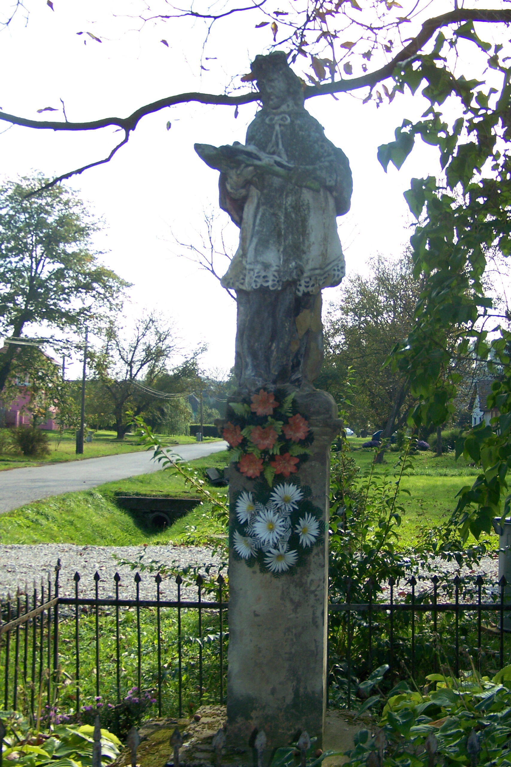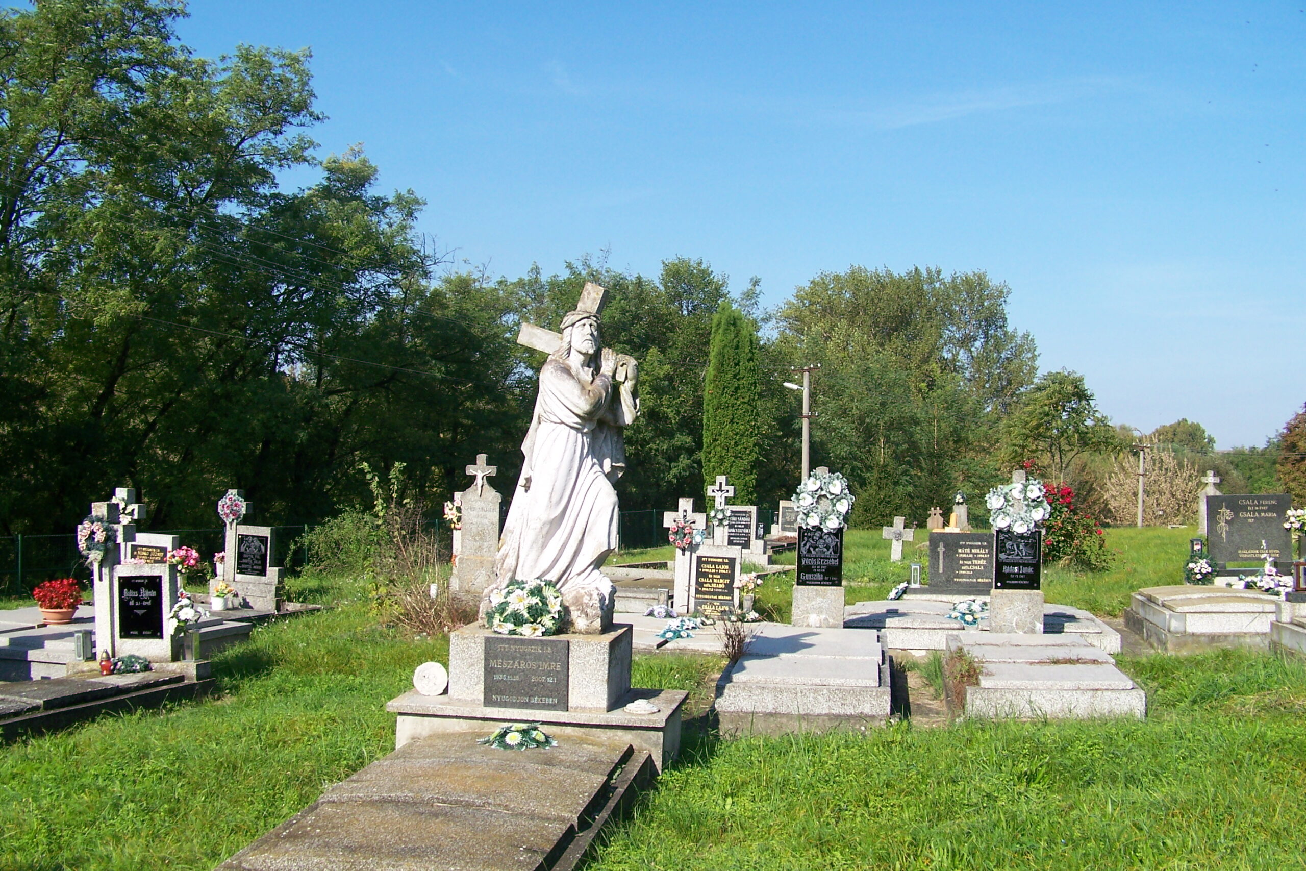 A betonalapzatra helyezett oszlop fekete márvány tábláján az „Isten dicsőségére/ ezt a keresztet állítatta/A.M./1968/Dicsértessék az Úr/Jézus Krisztus” felirat olvasható. A műkőből készült, felfelé keskenyülő oszlopfőn áll az egyenes szárvégű, INRI feliratos kereszt. Rajta ágyéktakaróval ellátott ezüstözött vaskorpusz függ. Krisztus töviskoszorús feje jobb felé fordított, lábszárai, illetve lábfejei egymás mellett, kezei a testhez közel, függőlegesen vannak...