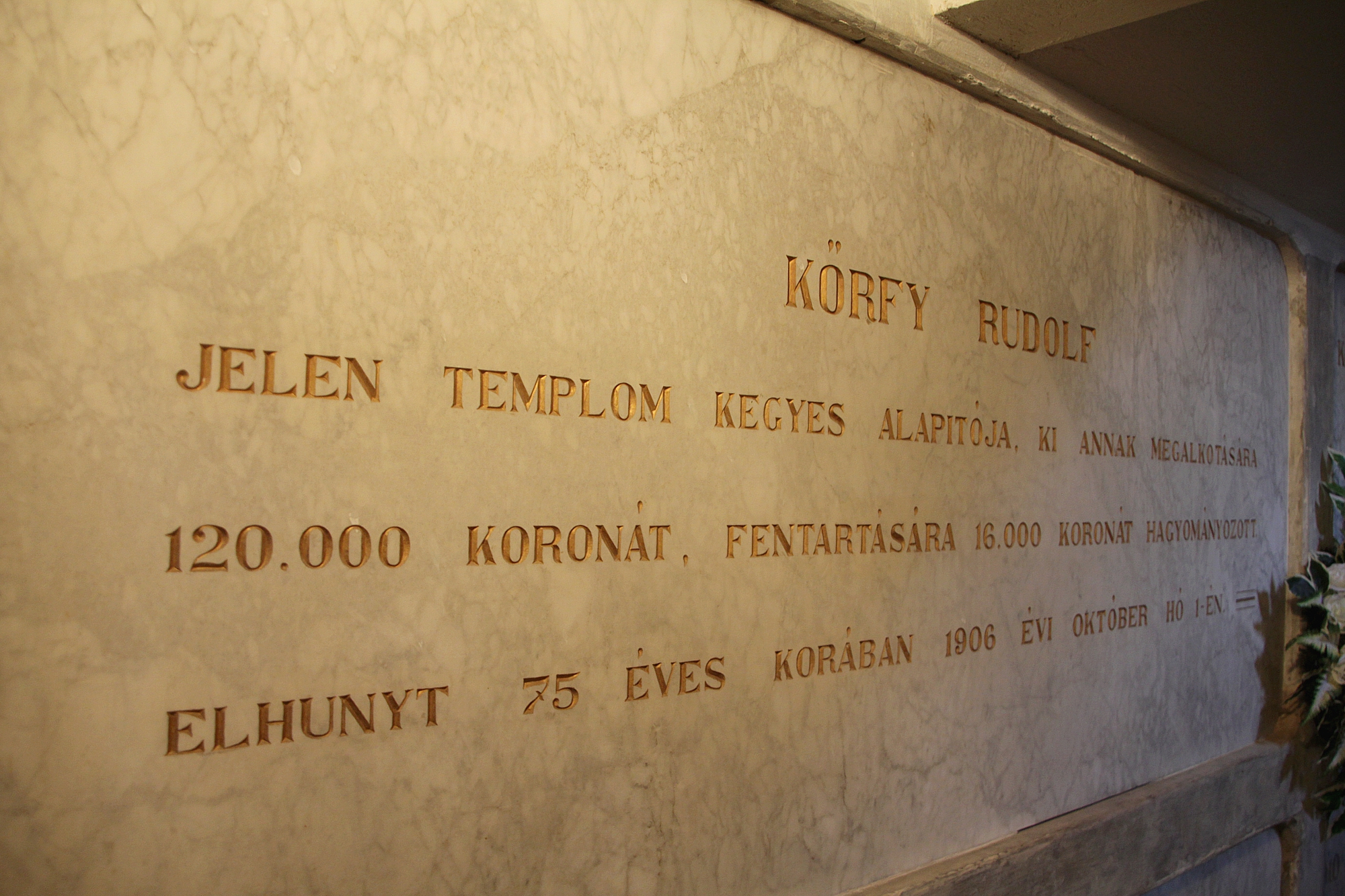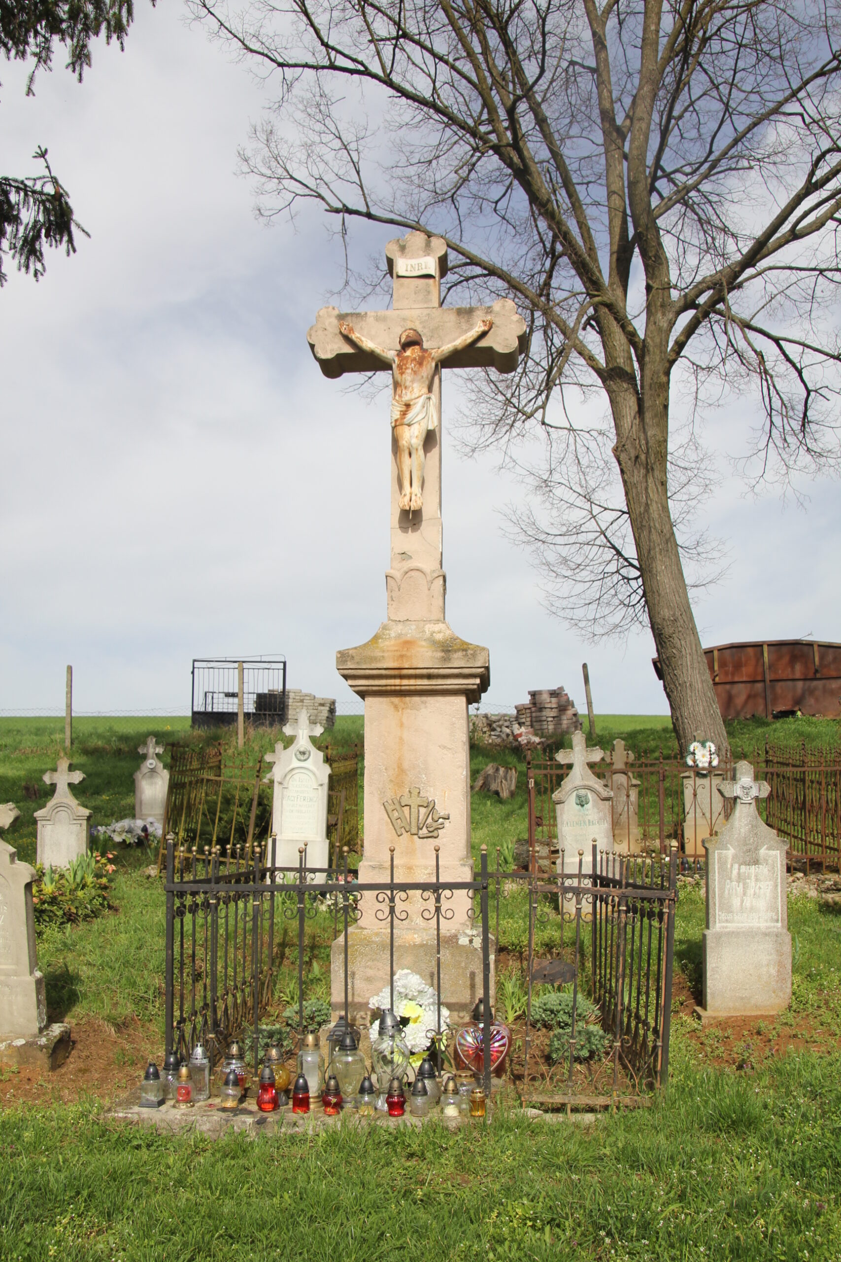 A temető központi kőkeresztjén ég felé fordított arcú, fehér ágyékkötős, fehér színű, kissé rozsdásodó Krisztus korpusz látható, felette INRI felirat. A talapzaton a keresztre feszítés eszközeit, létrát, fogót, szögeket, kalapácsot láthatunk. Ezen eszközök között egy kereszt is megjelenik a kompozíció közepén.