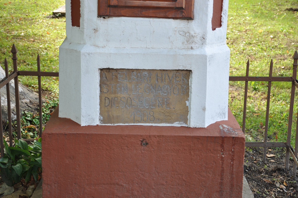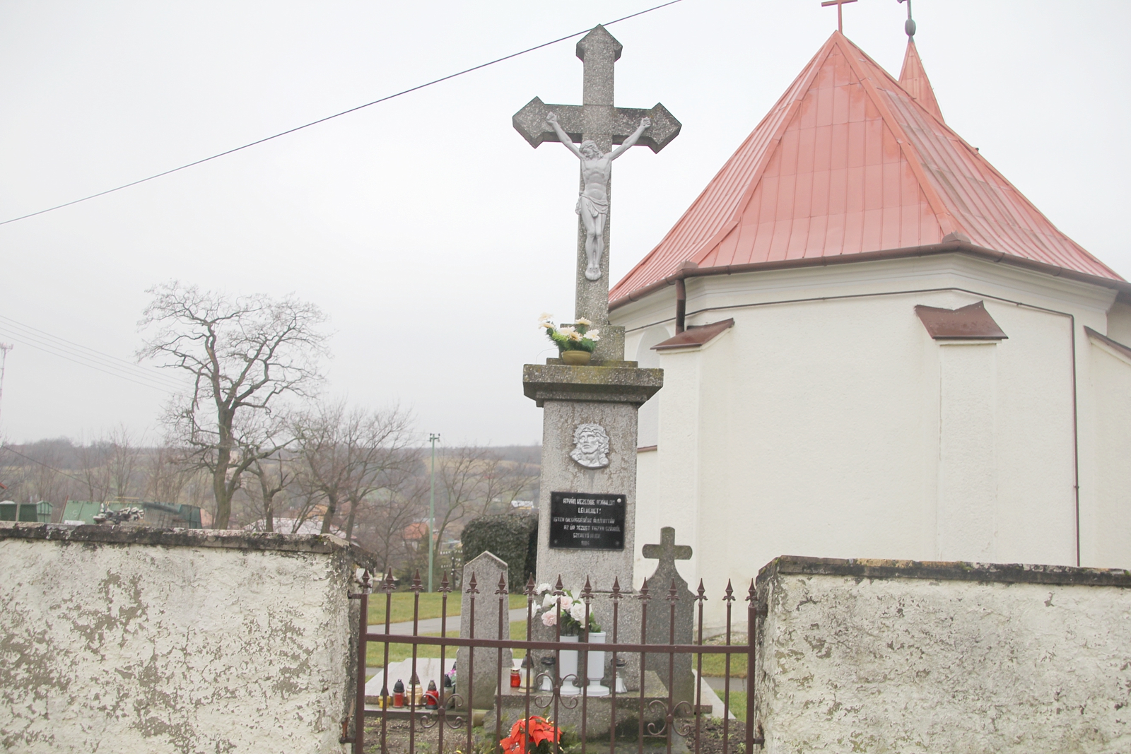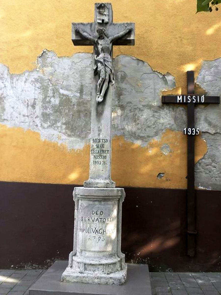 A római katolikus templom mögött látható sötét színű kőkereszt, a templomnak háttal áll, ezüstre festett, lehajtott fejű Krisztus korpusszal. Talapzatán szintén ezüstre festett Krisztus fej látható, valamint fekete márványtábla felirattal.Read More