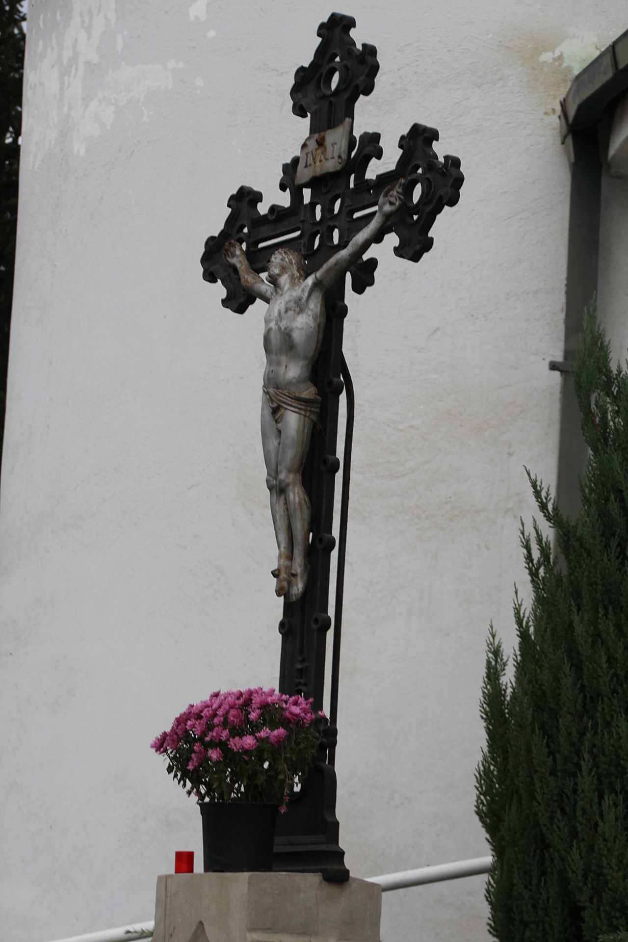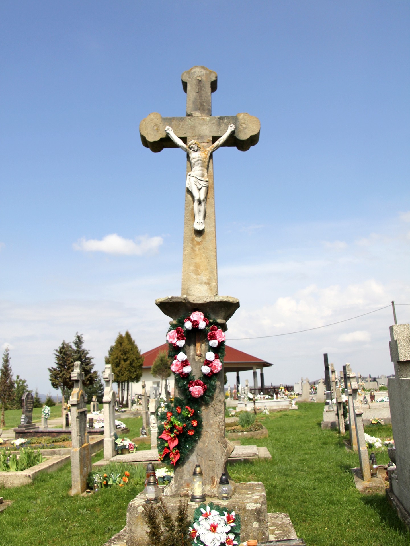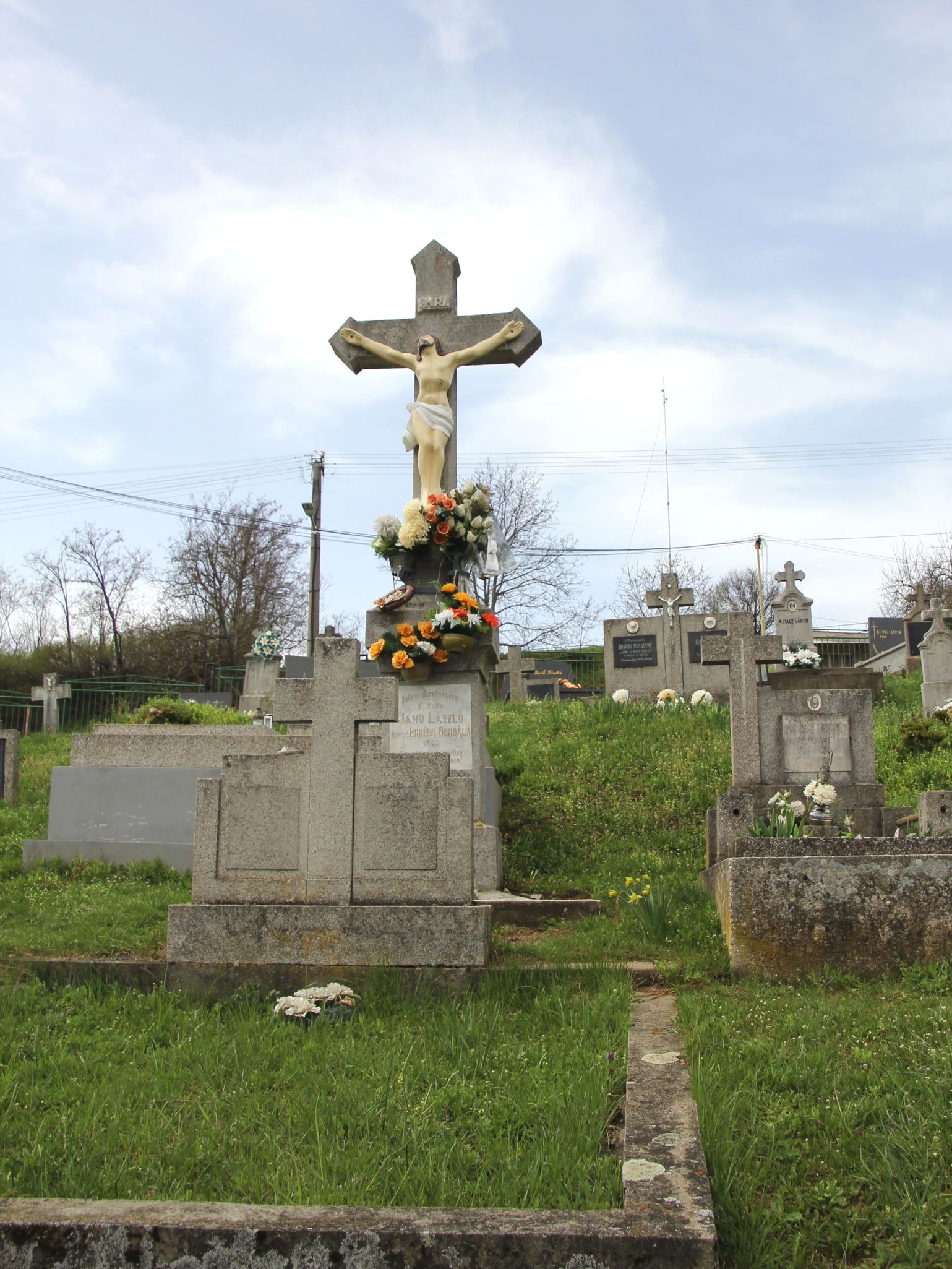 A temető bejáratától balra, középtájon helyezkedik el. Betontalapzatú kőkereszt, fehér korpusszal, felette INRI felirat. Krisztus feje az ég felé fordul, lábai egymás mellett vannak. A talapzaton felirat olvasható.Read More