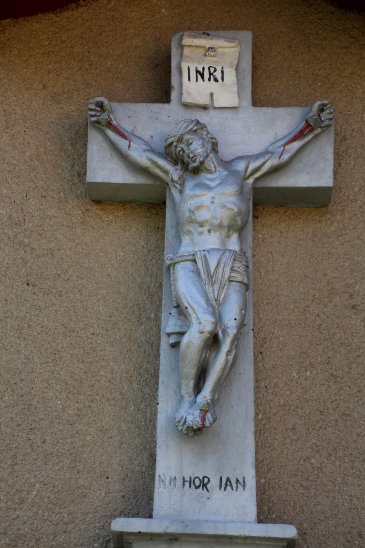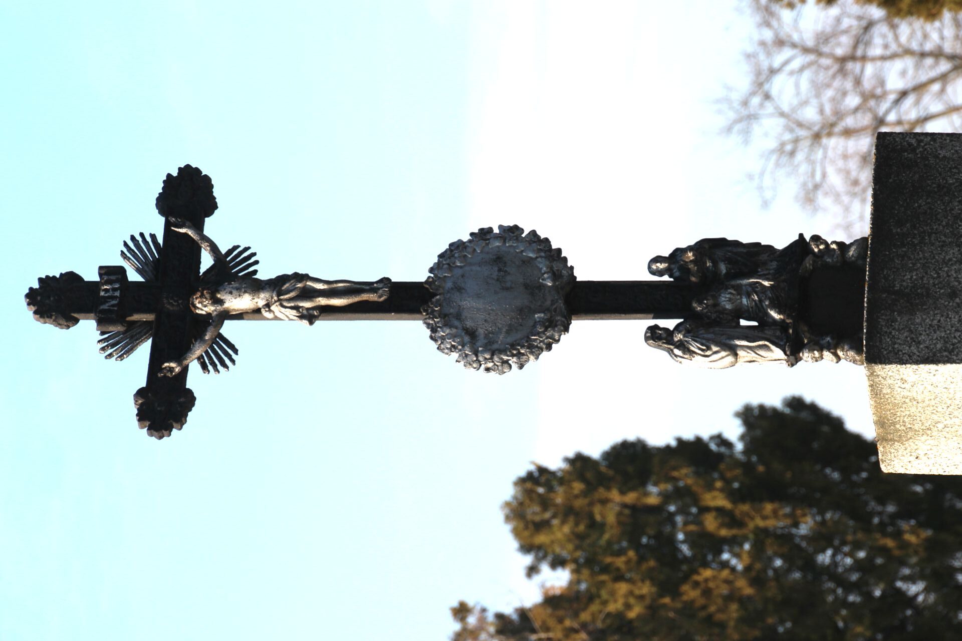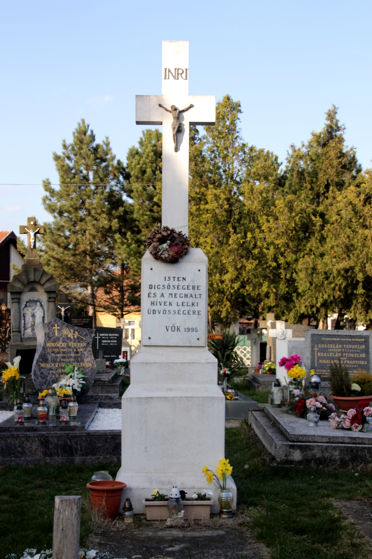 A temető bejáratától balra, középtájon helyezkedik el. Betontalapzatú kőkereszt, fehér korpusszal, felette INRI felirat. Krisztus feje az ég felé fordul, lábai egymás mellett vannak. A talapzaton felirat olvasható.Read More