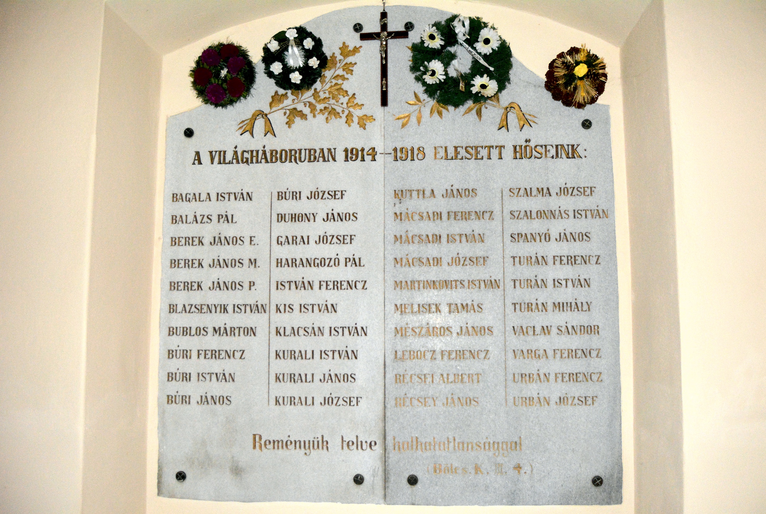 A katolikus templom főhajójának falán találjuk az 1936-ban az I. világégés helyi hősi halottjaira emlékező, arany betűkkel teleírt, vörösmárvány táblát.Read More