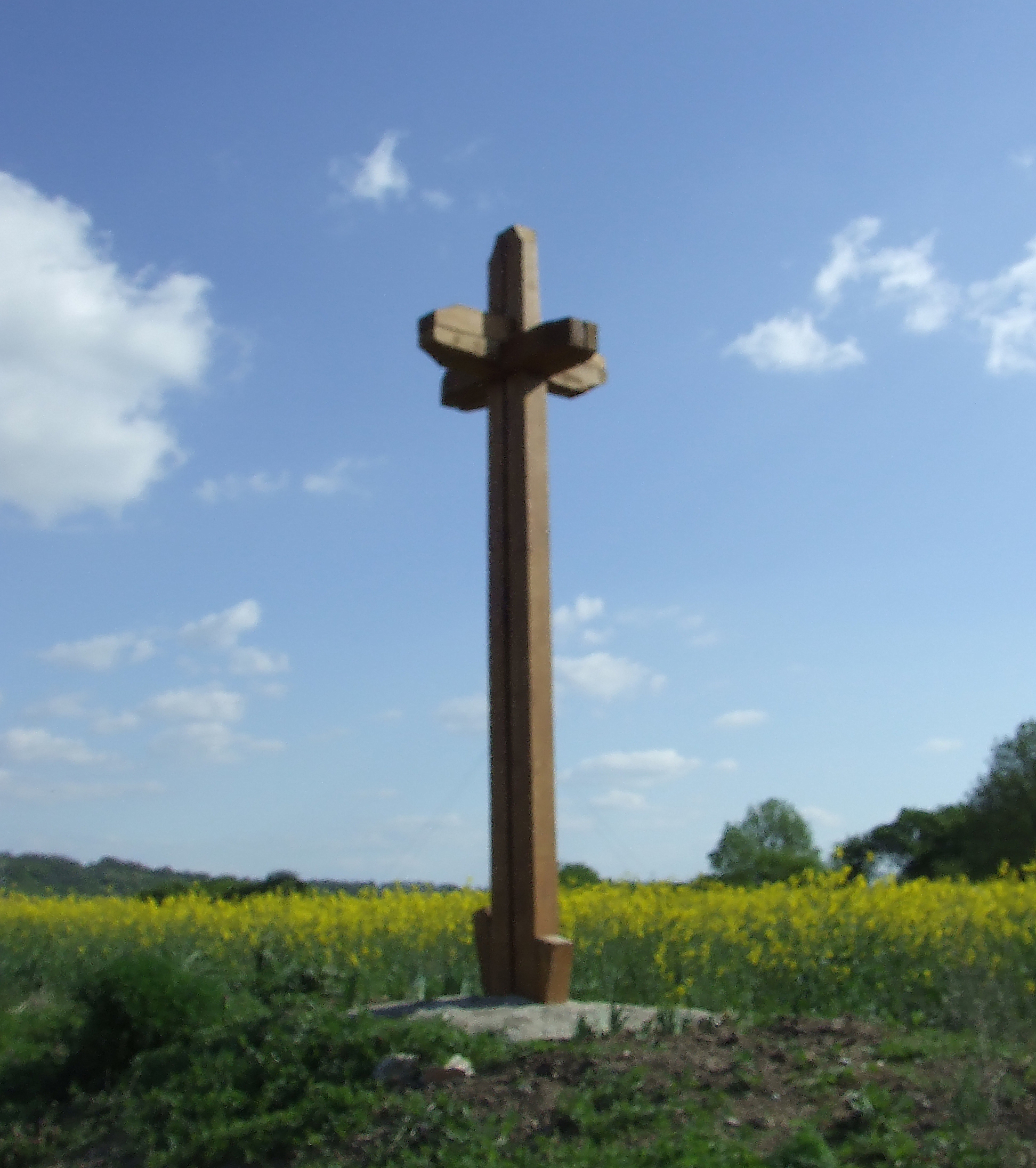 A templom kertjében áll, a bejárathoz képest a jobb oldalon. A felújitott sárga kőkereszten fehér kő Krisztus függ. Feje fölött fehér INRI felirat látható. Talapzatán Fehér Mária fej dombormű látható, alatta felirat fekete táblán.Read More