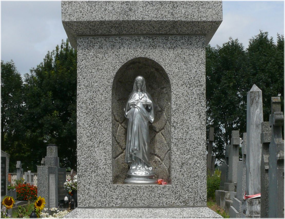 A falu központjában álló, ikonográfiai szempontból ritkának mondható, későbarokk jellegű, puha kőből faragott, színezett felületű szoborcsoport. Az egyszerű, párkányokkal díszített, négyzet alapú hasáb alakú talapzaton három, egymásnak háttal forduló, egész alakos, mintegy fél életnagyságú szobor áll. Az alakok a 18-19. század kedvelt, köztéri alkotásokon gyakran megjelenő szentek: Nepomuki Szent János, Szent Vendel és Szent Flórián....Read More