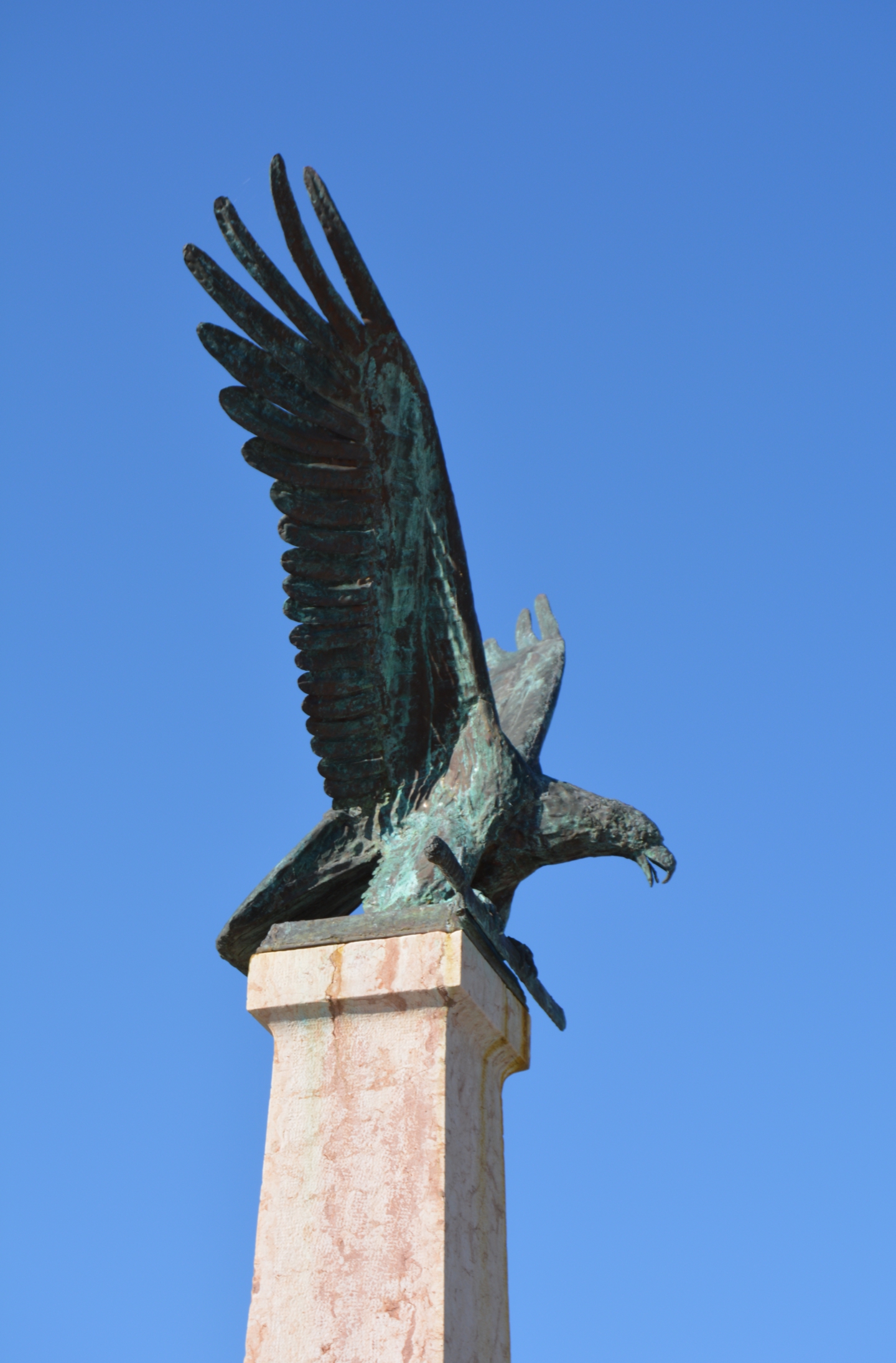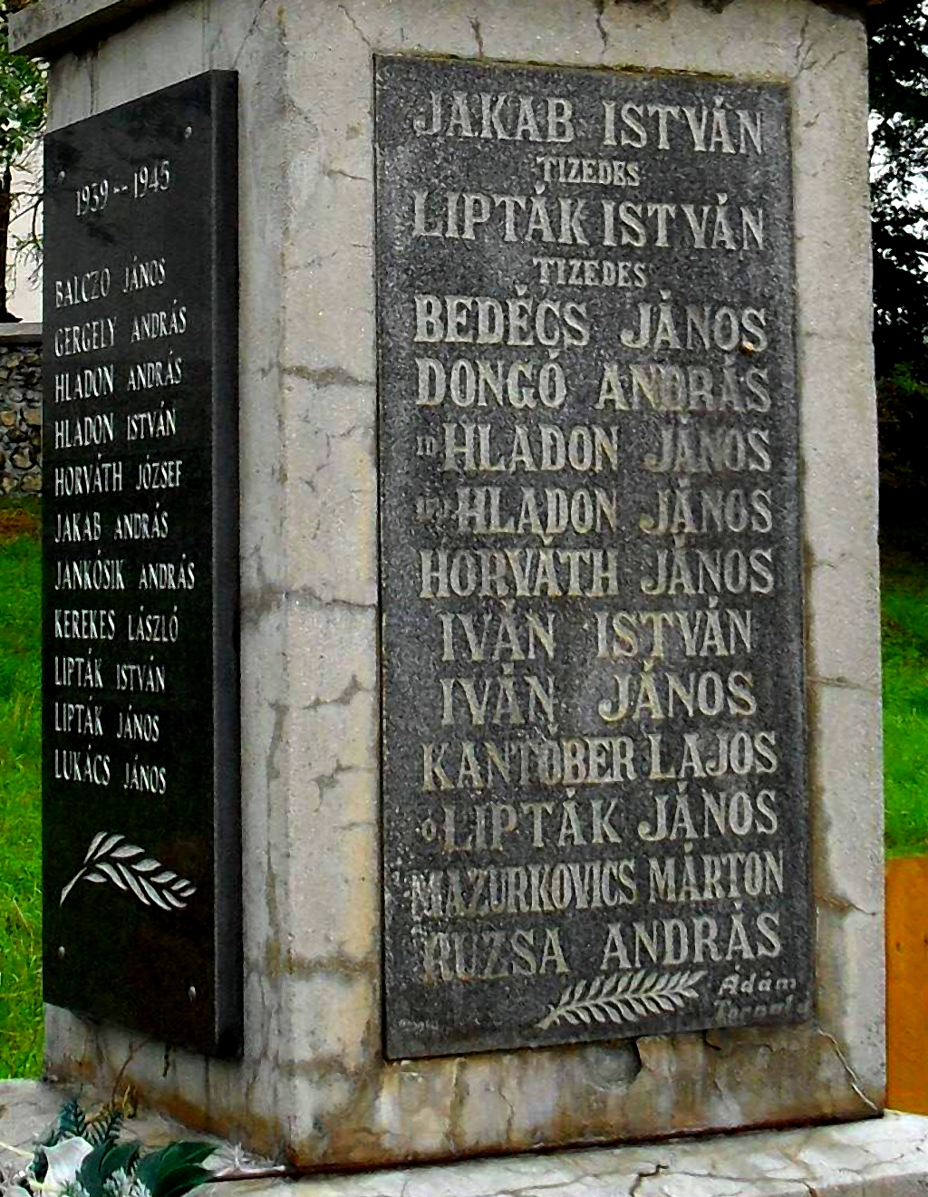 A kétrészes, világosszürke-kő oszlop felső részén kereszt, rohamsisak, kard és növényminta ábrázolás látható. Az alsó felén pedig felirat olvasható.Read More