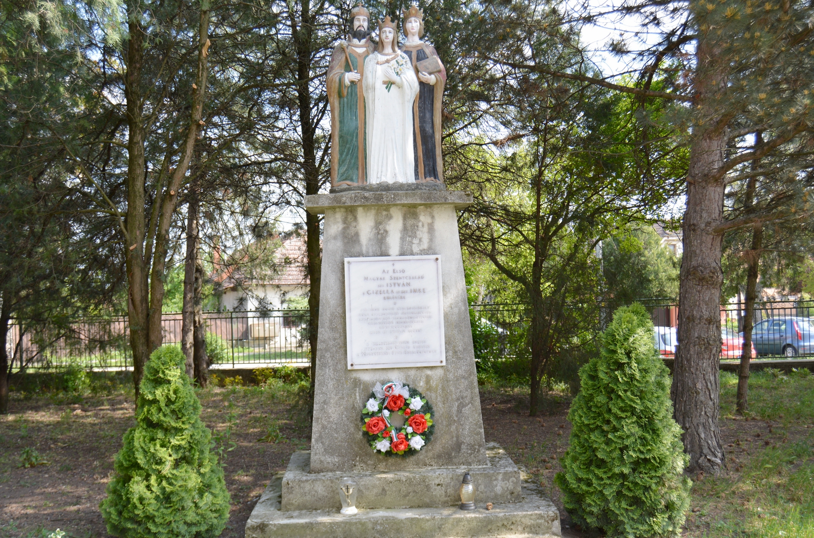A templom kertjében, a templom oldalbejárata előtt áll az Első Magyar Szent Család szoborcsoportja, amelyet 1996-ban a millecentenárium alkalmából emeltetett a nagycétényi férfikar. A négyzet alakú talapzaton álló szoborcsoport Szent István királyt, Boldog Gizellát és Imre herceget ábrázolja.Read More
