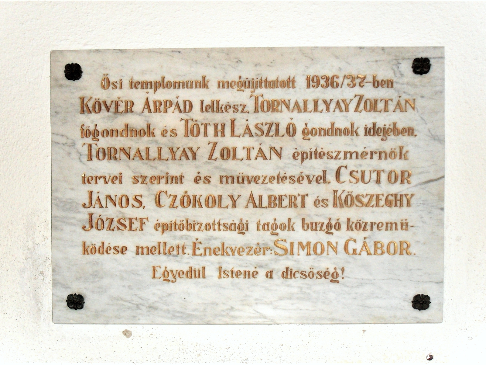 A református templomban 1936-ban felújítási emléktáblát és P. Tatai Sámuel gályarab prédikátor emléktábláját helyezték el. Kövér Árpád lelkész, Tornallyay Zoltán főgondnok és Tóth László gondnok idejében, Tornallyay Zoltán építészmérnök tervei szerint és művezetésével. Csutor János, Czókoly Albert és Kőszeghy József építőbizottsági tagok buzgó közreműködése mellett. Énekvezér: Simon Gábor.Read More