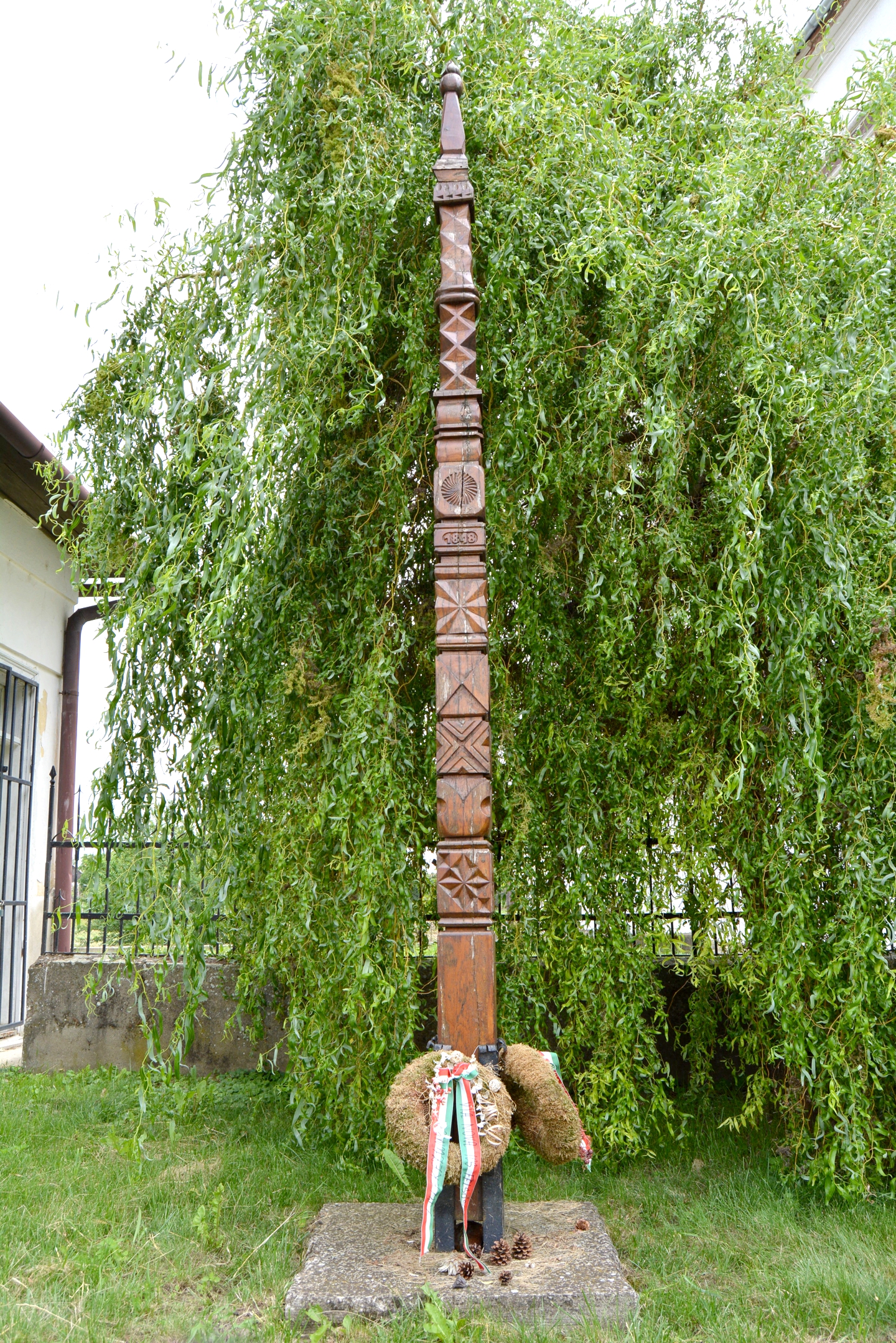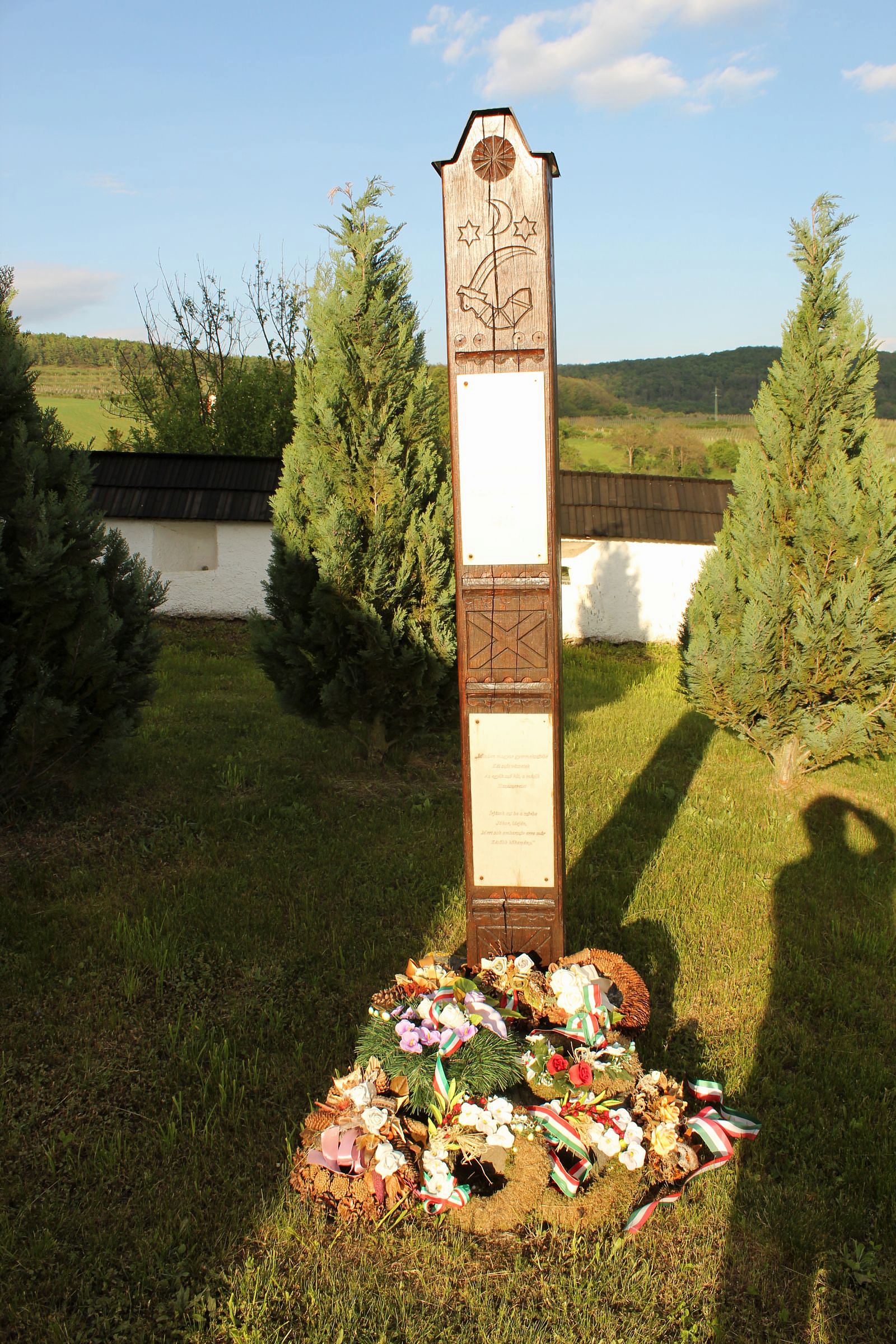 A falu közepén álló emlékhely fa lécekkel kerítették körbe. A kopjafa tetejét a magyar címer díszíti, de tulipán, nap, csillag motívum is látható rajta. Az alsó harmadán pedig sárga, fémtábla látható, fölötte pedig vésett szöveg.Read More