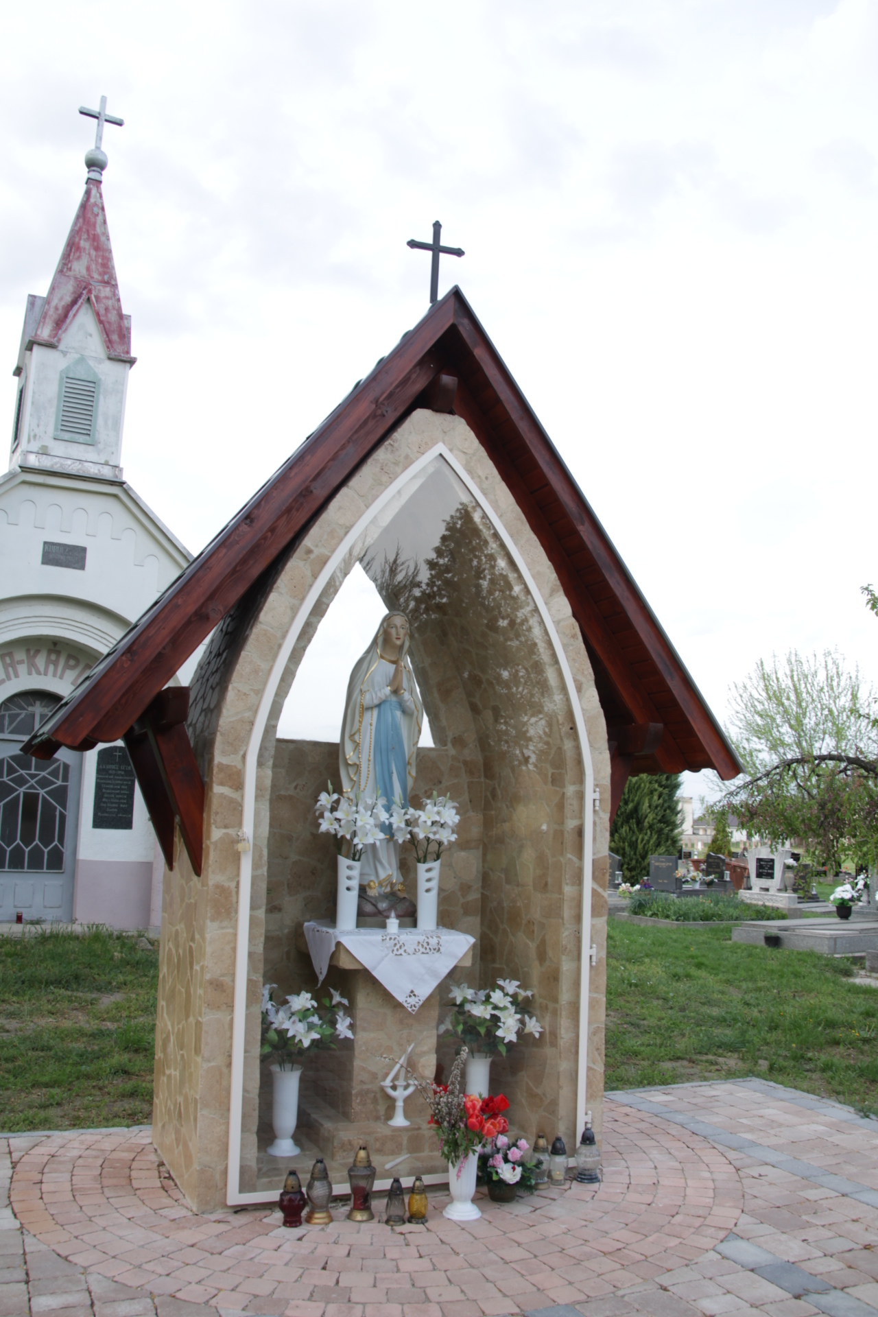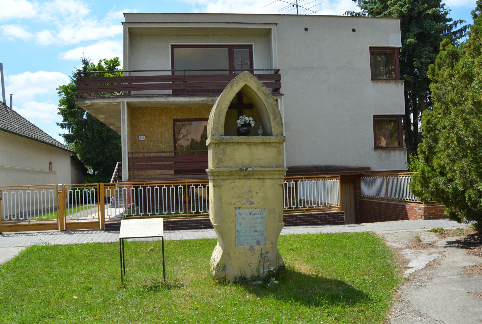 Szűz Mária dicsőítésére állíttatta Zsalkovics József 1907-ben. A négyszögletű alapra helyezett falfülkében Szeplőtelen Szűz Mária polikrómozott szobra látható. (A felvételek készültekor egy fakereszt volt a szobor helyén.)Read More