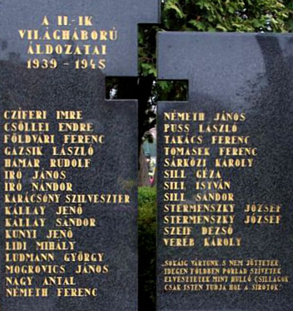 A II. világégés kegyetlen adót szedett a helyi lakosok soraiból: 22 életet követelt. A református templom kertjében van elhelyezve a II. világháború áldozatainak emlékműve, Gutmann A. és Sinko A. munkája. A talapzaton egy nyitott könyv formájában elhelyezett pilonban a 22 áldozat neve olvasható.