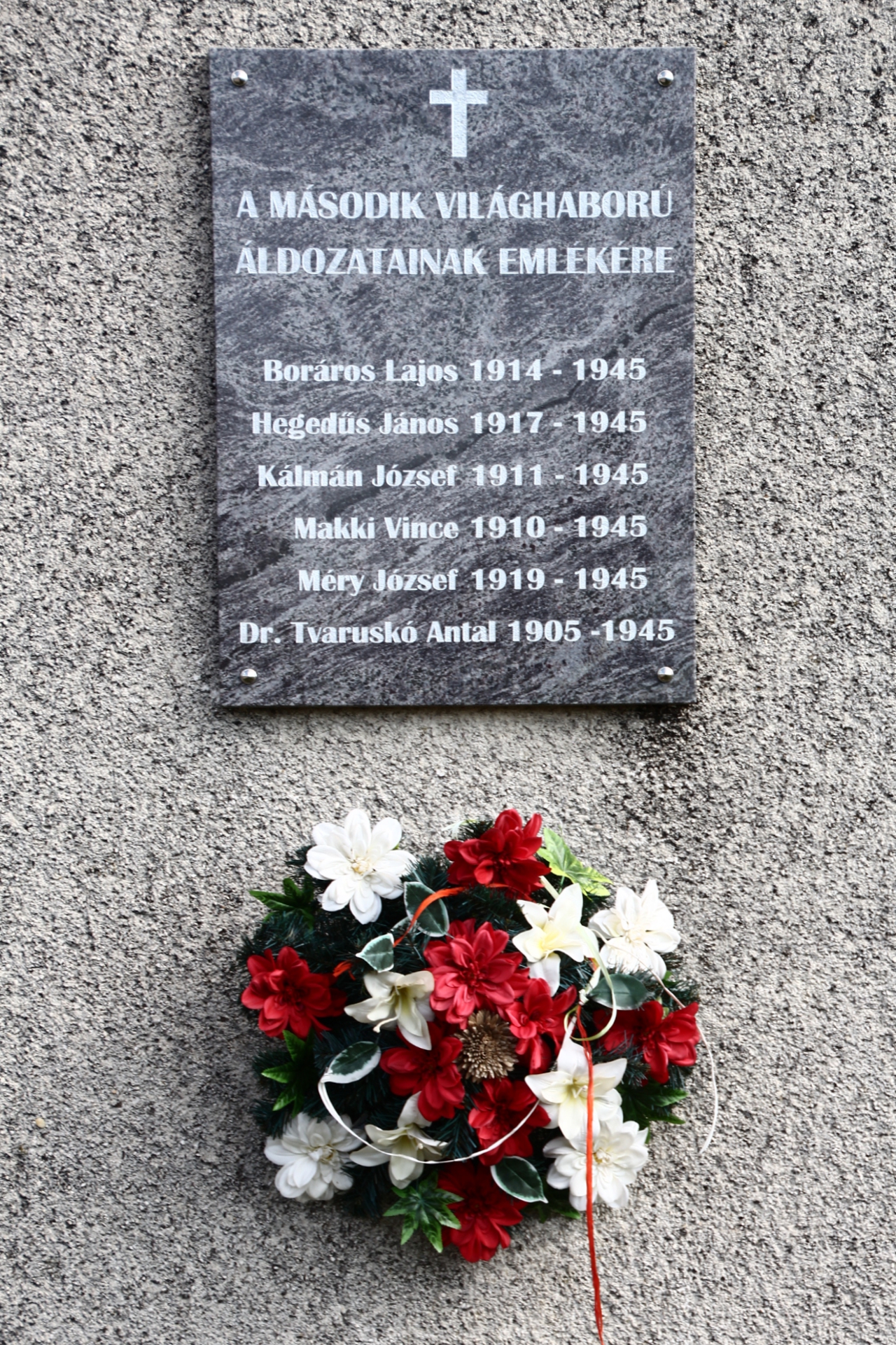 Fekete márványtáblán, ezüst szürkével olvashatók a siraki áldozatok nevei.