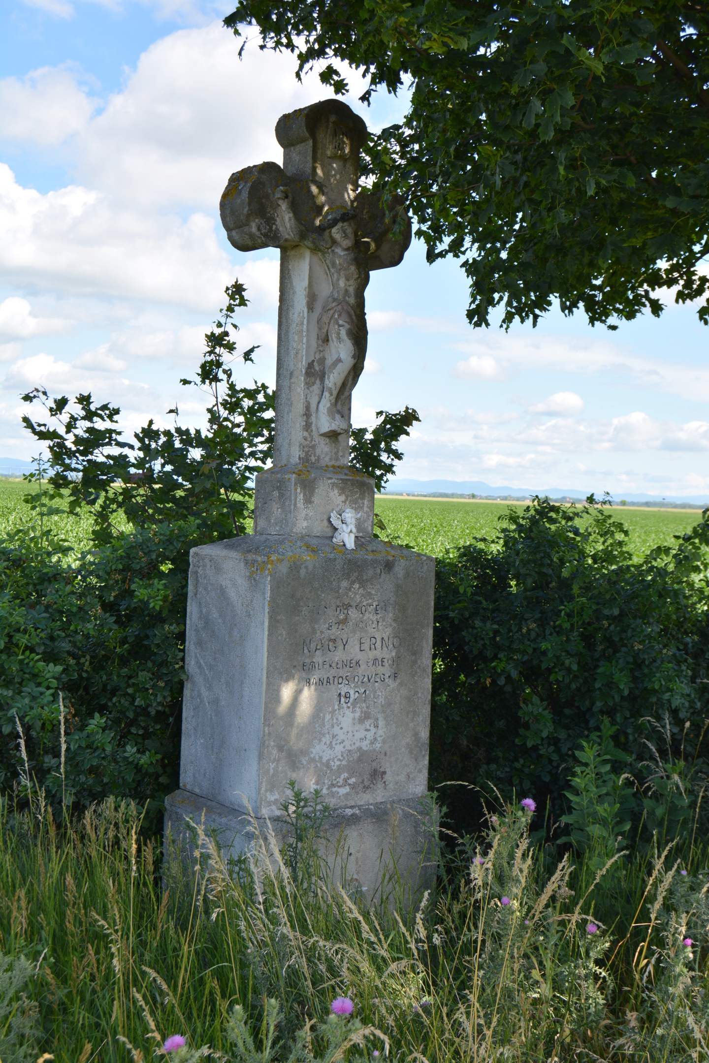 A templom kertjében, közvetlenül a kovácsoltvas bejárati kaputól balra található sötétszürke kereszt, ezüstfehér Krisztus-testtel. A korpusz felett díszes INRI felirat látható. Krisztus kezei majdnem függőlegesen vannak felszegezve, lábai szorosan egymás mellett párhuzamosan állnak. A szobor fehér talapzatán fekete márványtábla, fehér betűkkel látható.Read More