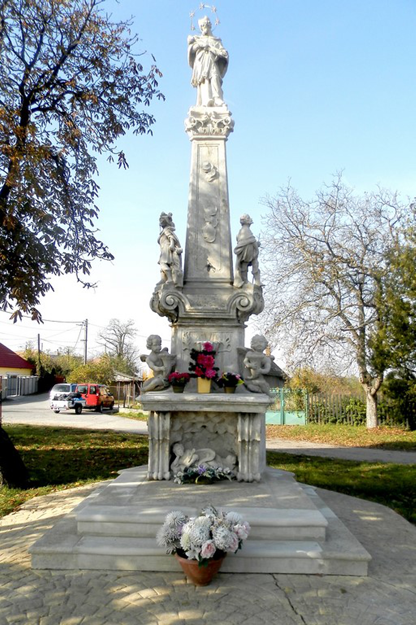 A háromszög hatású szoborcsoport oszlopszerű talapzatán Nepomuki Szent János-szobor, dicsfénnyel, ezen hatágú csillagokkal. Jobb kezére helyezve a feszület, baljában pálmaággal. Az oszlopzat alsó része körül csigavonalas talapzatokon további szentek szobrai: Szent Flórián, Szent Rókus és Szent Sebestyén. Három angyalkás figurával, kezükben kürttel. Az objektum elülső részét nézve egy oltárasztal-szerűséget látunk, ez alatt egy barlangban Szent...Read More