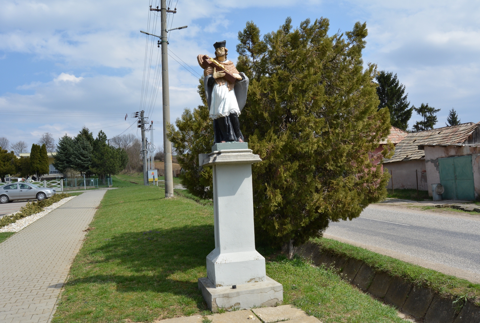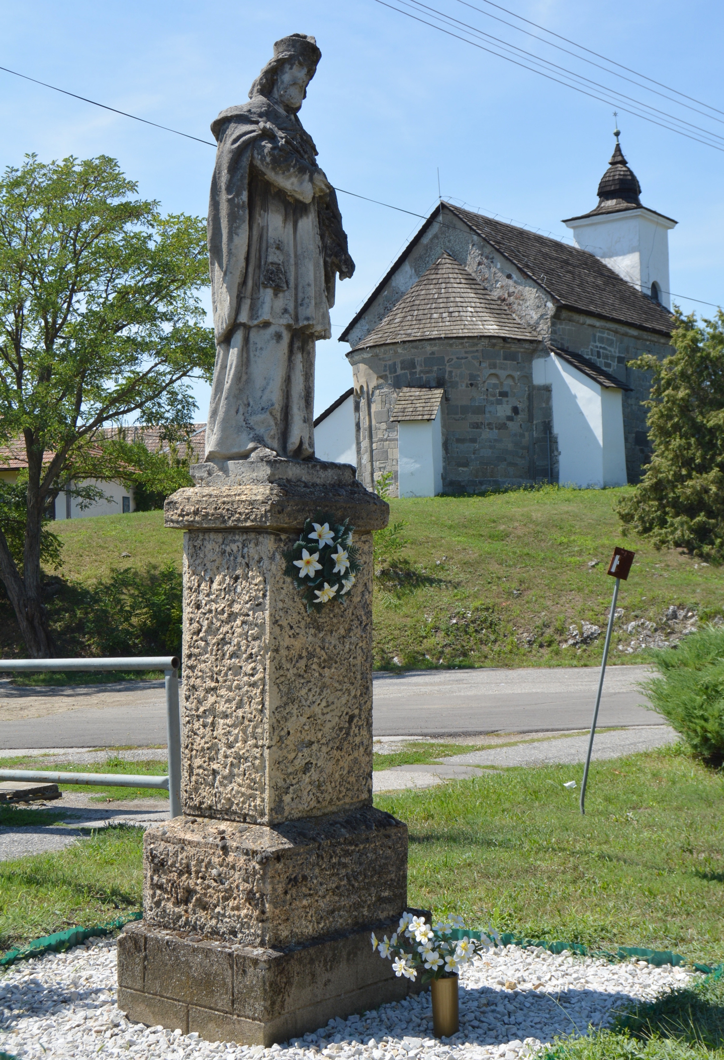 A templomkertben, közel a falun átfolyó patakhoz, egy magas kőtalapzaton helyezték el Nepomuki Szent János szobrát. Egyesek szerint ez azóta van itt mióta a templom megépült. Ám a hidak, folyók, vizimolnárok és a gyónási titok védőszentjének szobra ennél régebbi alkotás lehet, valószínűleg a XIX. századból származik. János fekete birétumban, fekete reverendában, fehér karingben és rövid...Read More