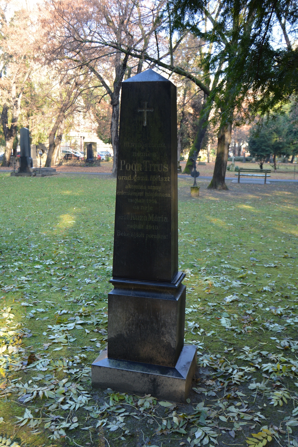 Poór Titus uradalmi gazd. főtiszt, a koronás arany érdemkereszt tulajdonosának és nejének Kuza Máriának sírja. A síremlék a temető I./1-es szektorában található.Read More