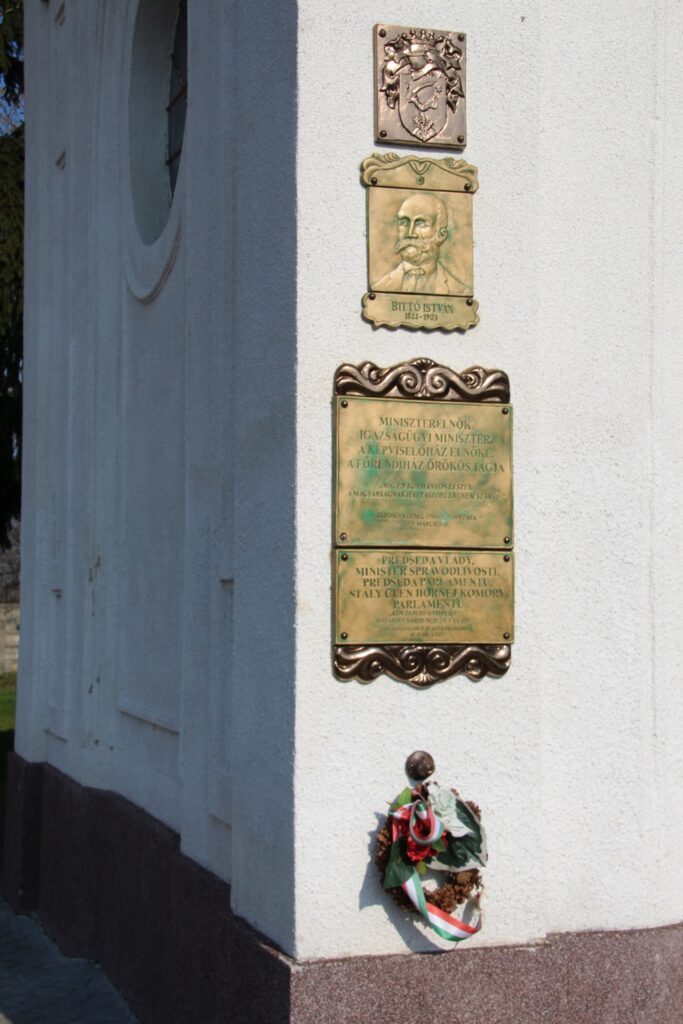 FeliratMINISZTERELNÖK. / IGAZSÁGÜGYI MINISZTER. / A KÉPVISELŐHÁZ ELNÖKE. / A FŐRENDIHÁZ ÖRÖKÖS TAGJA / "MÍG ÉN KORMÁNYON LESZEK: / A MAGYARSÁGNAK HÁTRASZORULNI NEM SZABAD." / aláírás / SÁROSFA KÖZSÉG ÖNKORMÁNYZATA / 2012. MÁRCIUS 18. // Takács Gy. / 2012 // A BITTÓ CSALÁD SÍRBOLTJA / BITTÓ ISTVÁN MINISZTERELNÖK SÍRHELYE / FELÚJÍTOTTA / A PRO PATRIA HONISMERETI SZÖVETSÉG / A NEMZETI KULTURÁLIS ÖRÖKSÉG MINISZTÉRIUMA / ÉS AZ ILLYÉS KÖZALAPÍTVÁNY TÁMOGATÁSÁVAL / 2003