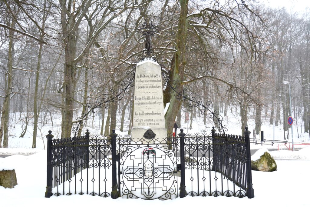„A Szalma-gunyhótól nincs mesze azon emlékezetes hely, melyen 1866-ban az osztrák-porosz háboru idején számos katonánk elesett. Több sirhant található itt s azon szép emlék, melyet a pozsonyiak az itt elesettek emlékére emeltek. Évenkint kegyeletes emlékünnepély tanúja e hely.“