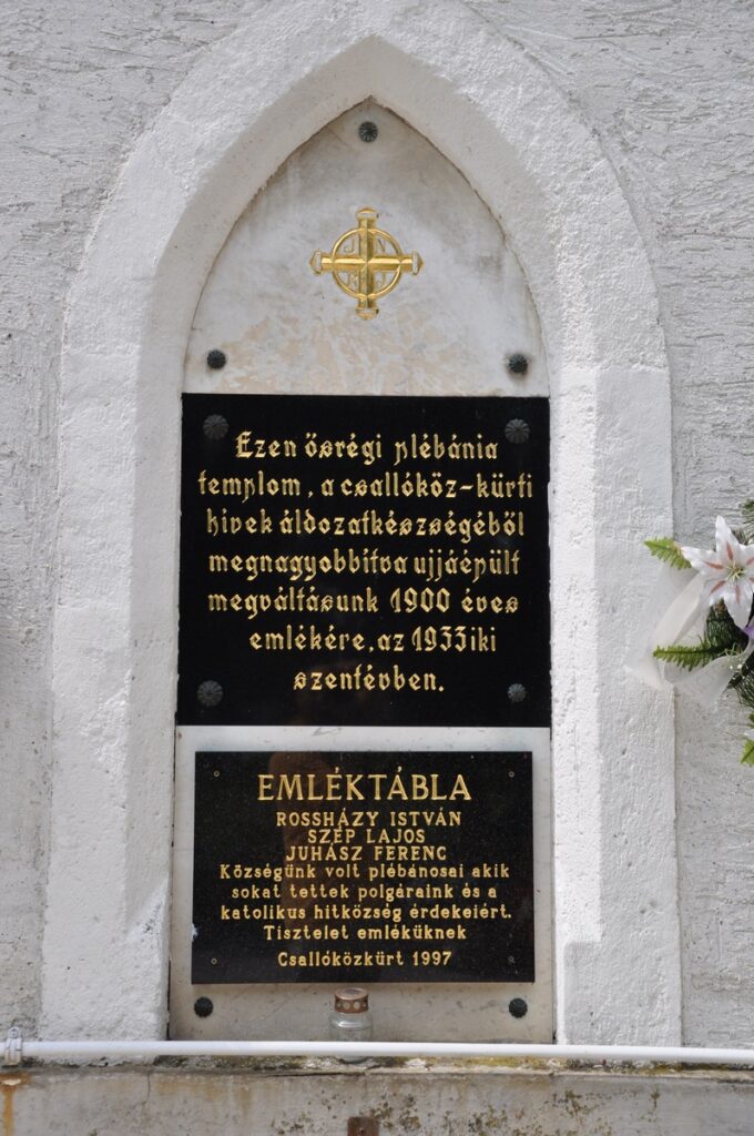 A másik emléktábla az egykori plébánosokra, Rossházy Istvánra, Szép Lajosra és Juhász Ferencre emlékezik.