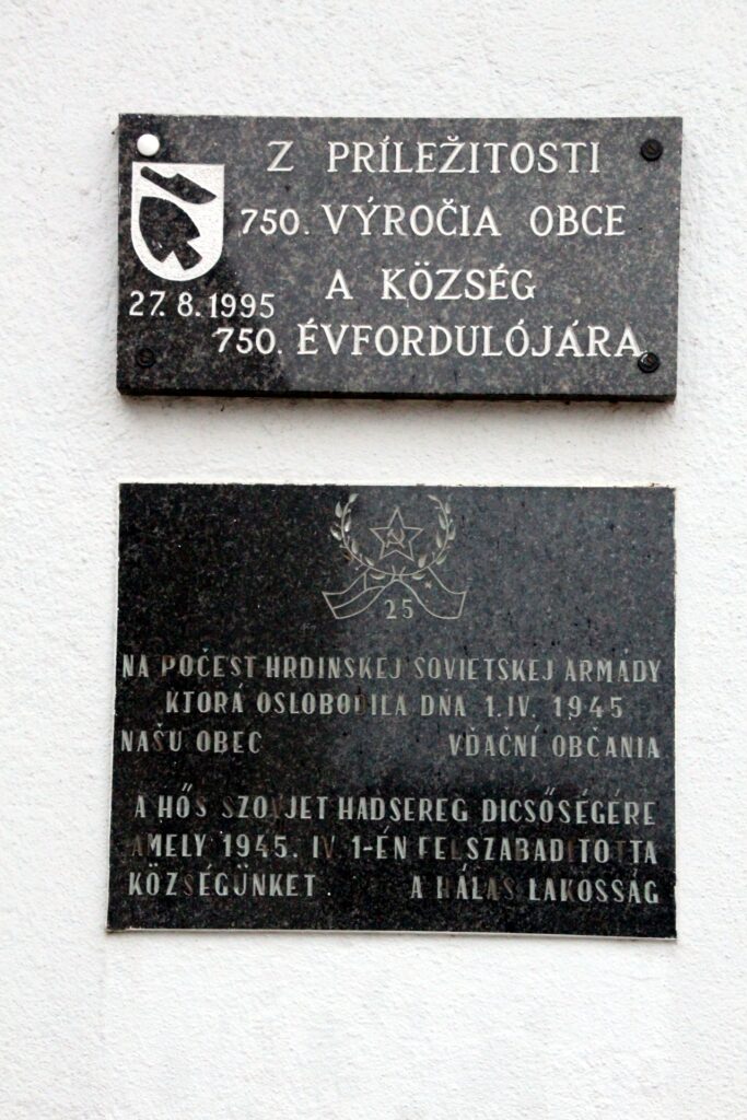 A községháza falán található emléktáblán szlovák és magyar felirat látható. Az emléktábla alatt a község 1945-ös, a szovjet hadsereg által felszabadított emléktábla található, szintén két nyelven.