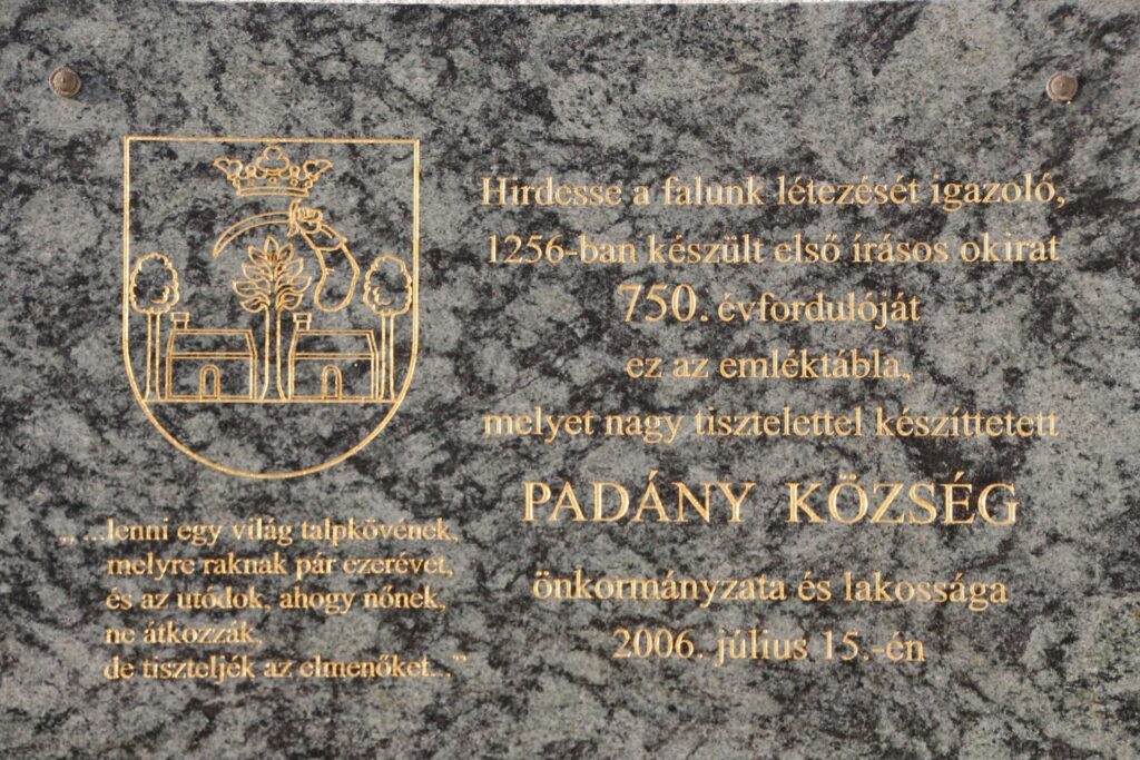 | Felirat | Hirdesse a falunk létezését igazoló, / 1256-ban készült első írásos okirat / 750. évfordulóját / ez az emléktábla, / melyet nagy tisztelettel készíttetett / PADÁNY KÖZSÉG / önkormányzata és lakossága / 2006. július 15.-én // "... lenni egy világ talpkövének, / melyre raknak pár ezerévet, / és az utódok, ahogy nőnek, / ne átkozzák, / de tiszteljék az elmenőket..." |