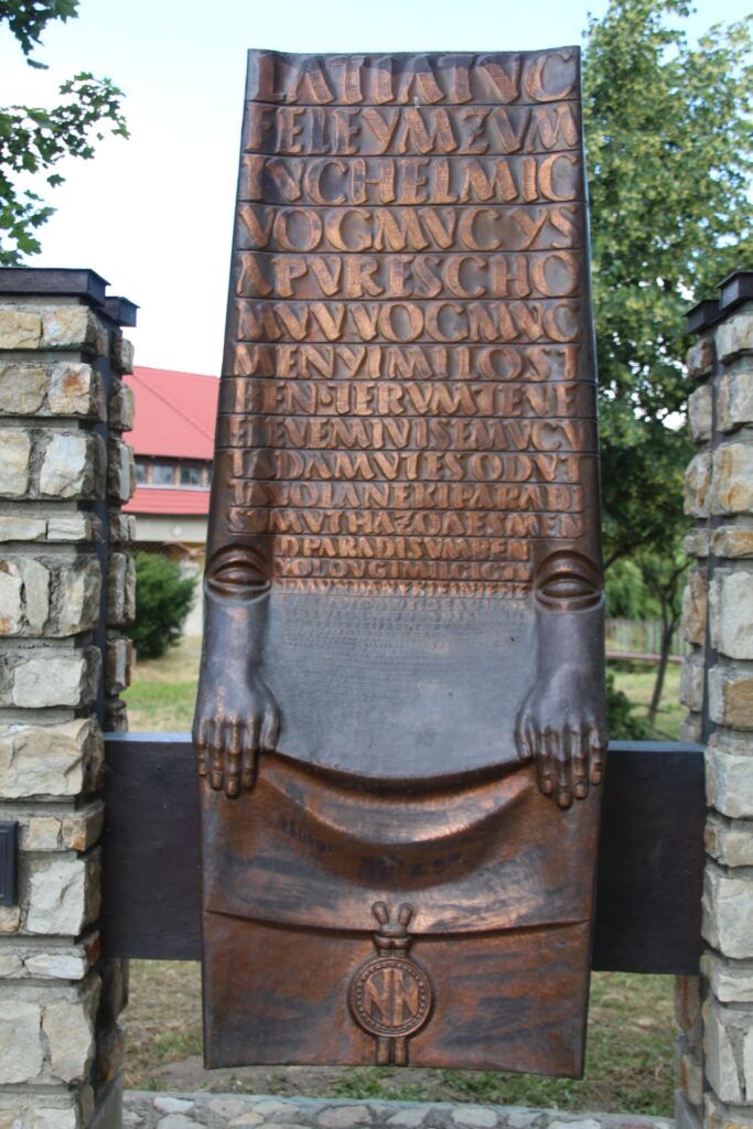 A halotti beszéd (Anonymus) szobra (szobor, emlékmű, emléktábla) (Hidaskürt [Mostová])