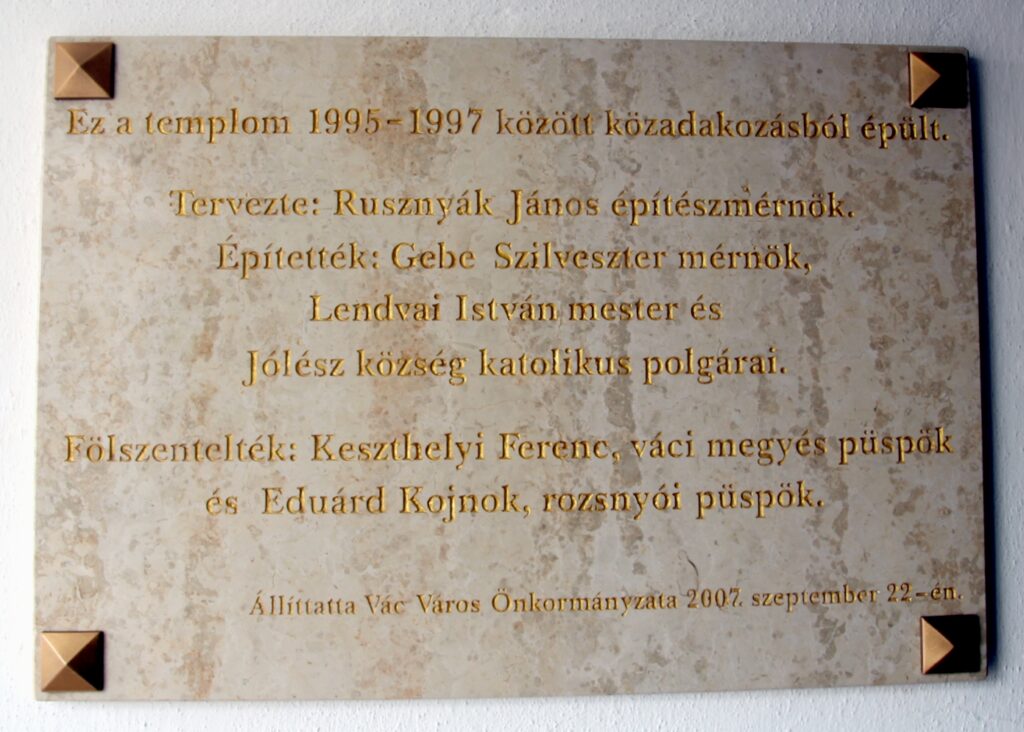 FeliratEz a templom 1995-1997 között közadakozásból épült, / Tervezte: Rusznyák János építészmérnök. / Építették: Gebe Szilveszter mérnök, / Lendvai István mester és / Jólész község katolikus polgárai. / Fölszentelték: Keszthelyi Ferenc, váci megyés püspök / és Eduárd Kojnok, rozsnyói püspök. / Állíttatta Vác Város Önkormányzata 2007. szeptember 22-én.
