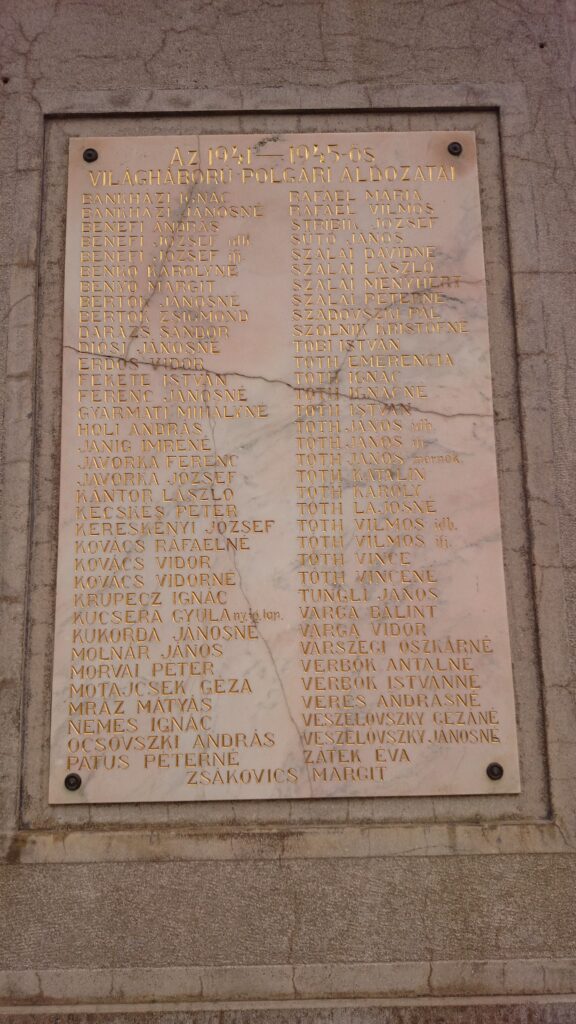| Felirat | A két világháború elesett hőseinek és polgári áldozatainak emlékére. 1914/18 --- 1941/45 |