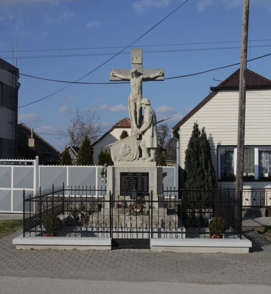 Felirat1914 - 1918 / A világháborúban elesett hőseink emlékére! / 7 név / Angyalok szálljanak oda, hol Hőseink nyugosznak, / A mi buzgó hő imánkat vigyék koszórúnak! // A MÁSODIK VILÁG HÁBÓRÚBAN / HŐSI HALÁLT HALT / SZIMETH FERENC / SZ. 1921. +. 1945. / A SIRONTÚL FENT AZ ÉGBEN / VISZONTLÁTHATJUK / MAJD EGYMÁST.