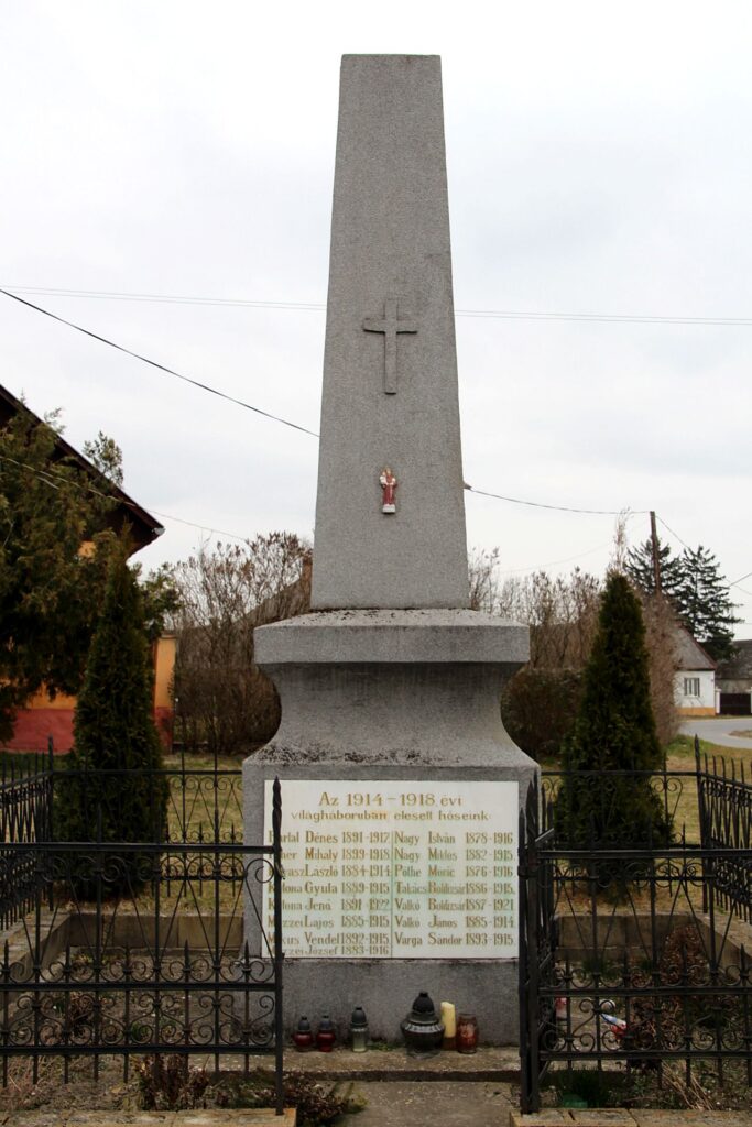 Felirat1914-1918 / ÉVI / HÁBORÚBAN / ELESETT KATONÁK / EMLÉKÉRE / Emeltette a / NAGYPAKAI / IFJÚSÁG // Az 1914 - 1918. évi / világháboruban elesett hőseink: / 15 név // Na pamiatku padlým obyvatelom obce v II. svetovej vojne / A II. világháborúban elesettek emlékére / 14 név