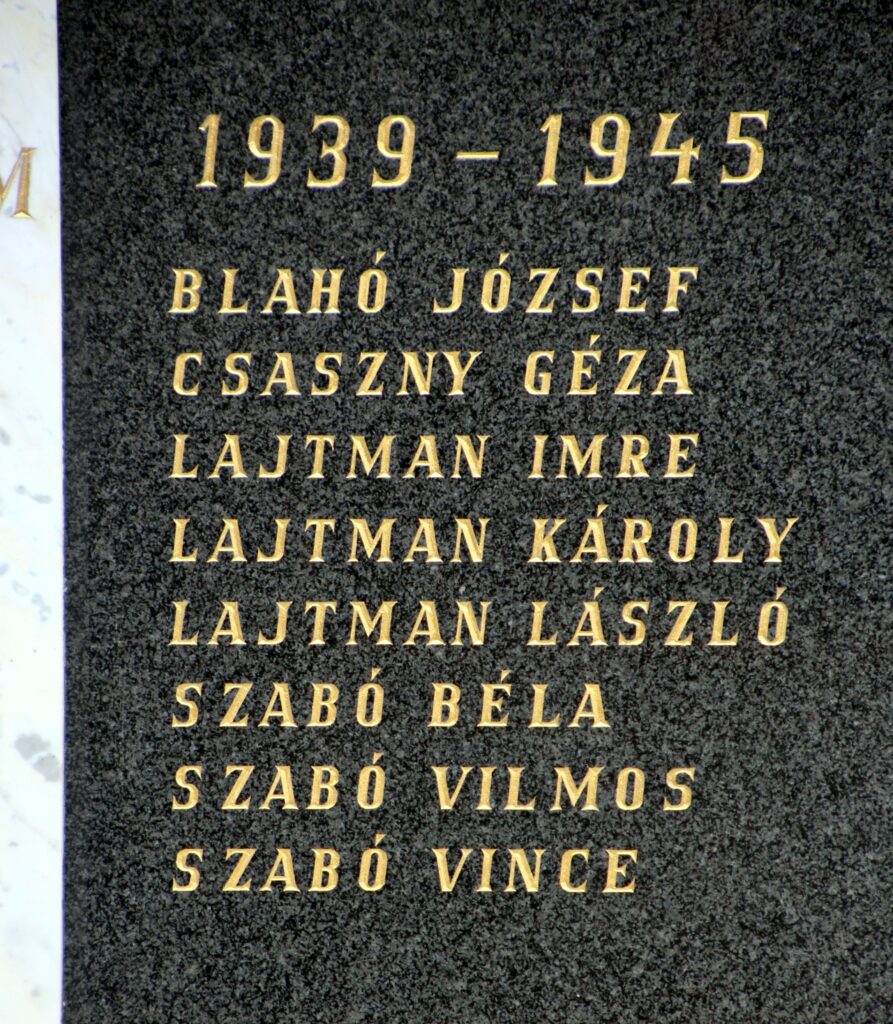 | Felirat | 1914 - 1918 / 14 név // IN / MEMORIAM // 1938 - 1945 / 8 név // 20. 8. 1993 |