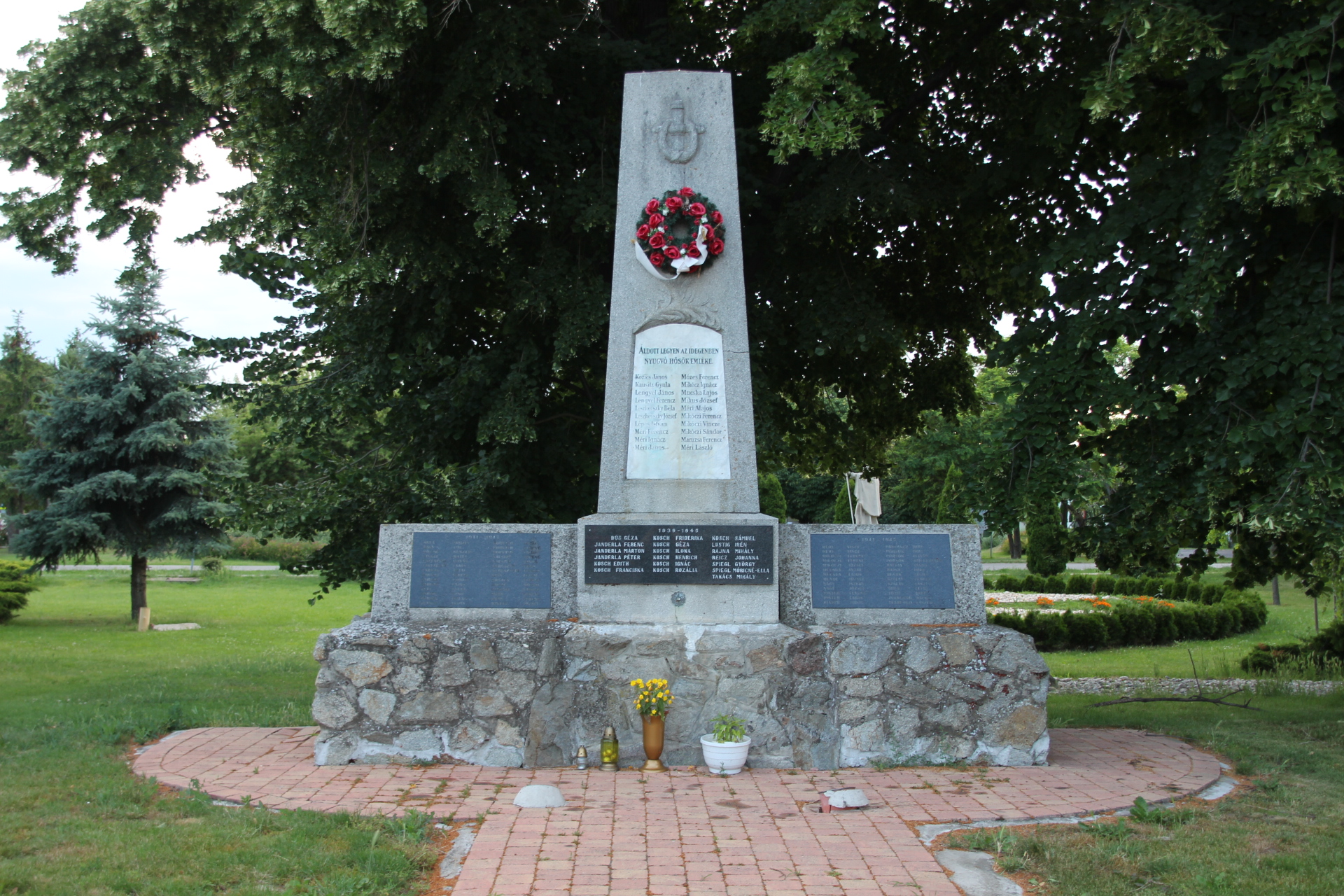 | Felirat | ÁLDOTT LEGYEN AZ IDEGENBEN / NYUGVÓ HŐSÖK EMLÉKE. / 20 név // 1941 - 1945 / 28 név // 1939 - 1945 / 19 név // 1941 - 1945 / 26 név // 1914 - 1918 / ELESETT HŐSÖK /20 név // 1914 - 1918 / ELESETT HŐSÖK. / 18 név |