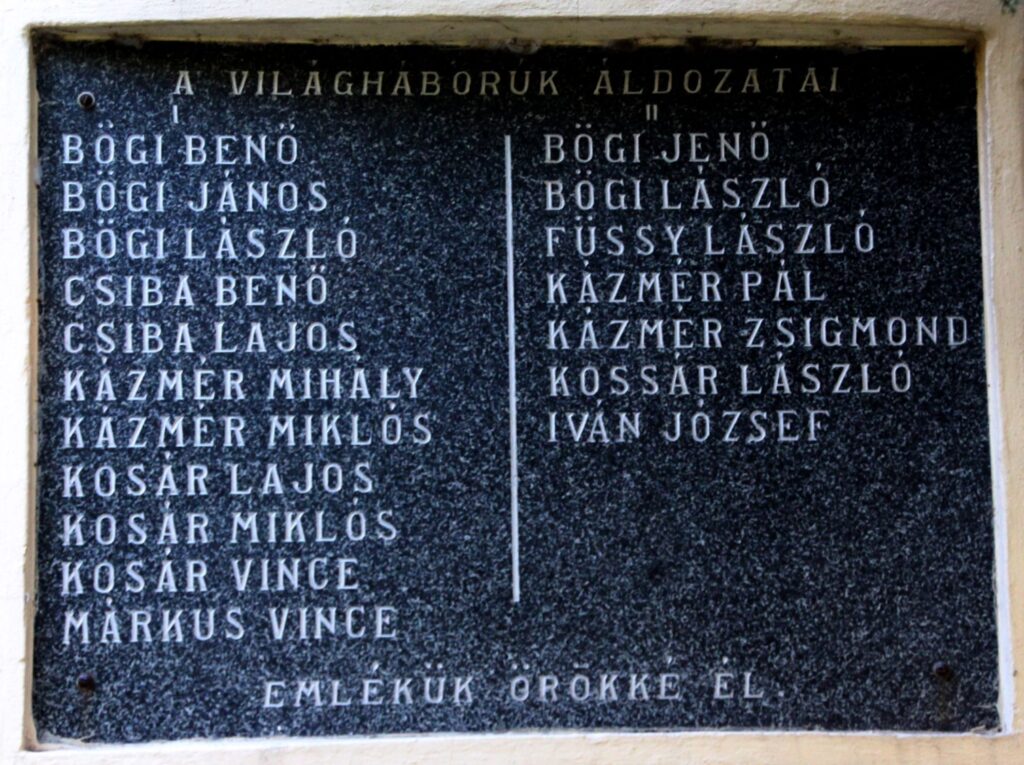| Felirat | A VILÁGHÁBORÚK ÁLDOZATAI / I / 11 név / II / 7 név / EMLÉKÜK ÖRÖKKÉ ÉL. |