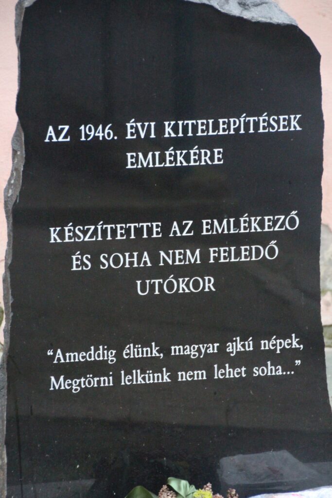 FeliratAZ 1946. ÉVI KITELEPÍTÉSEK / EMLÉKÉRE / KÉSZÍTETTE AZ EMLÉKEZŐ / ÉS SOHA NEM FELEDŐ / UTÓKOR / "Ameddig élünk, magyar ajkú népek, / Megtörni lelkünk nem lehet soha..."