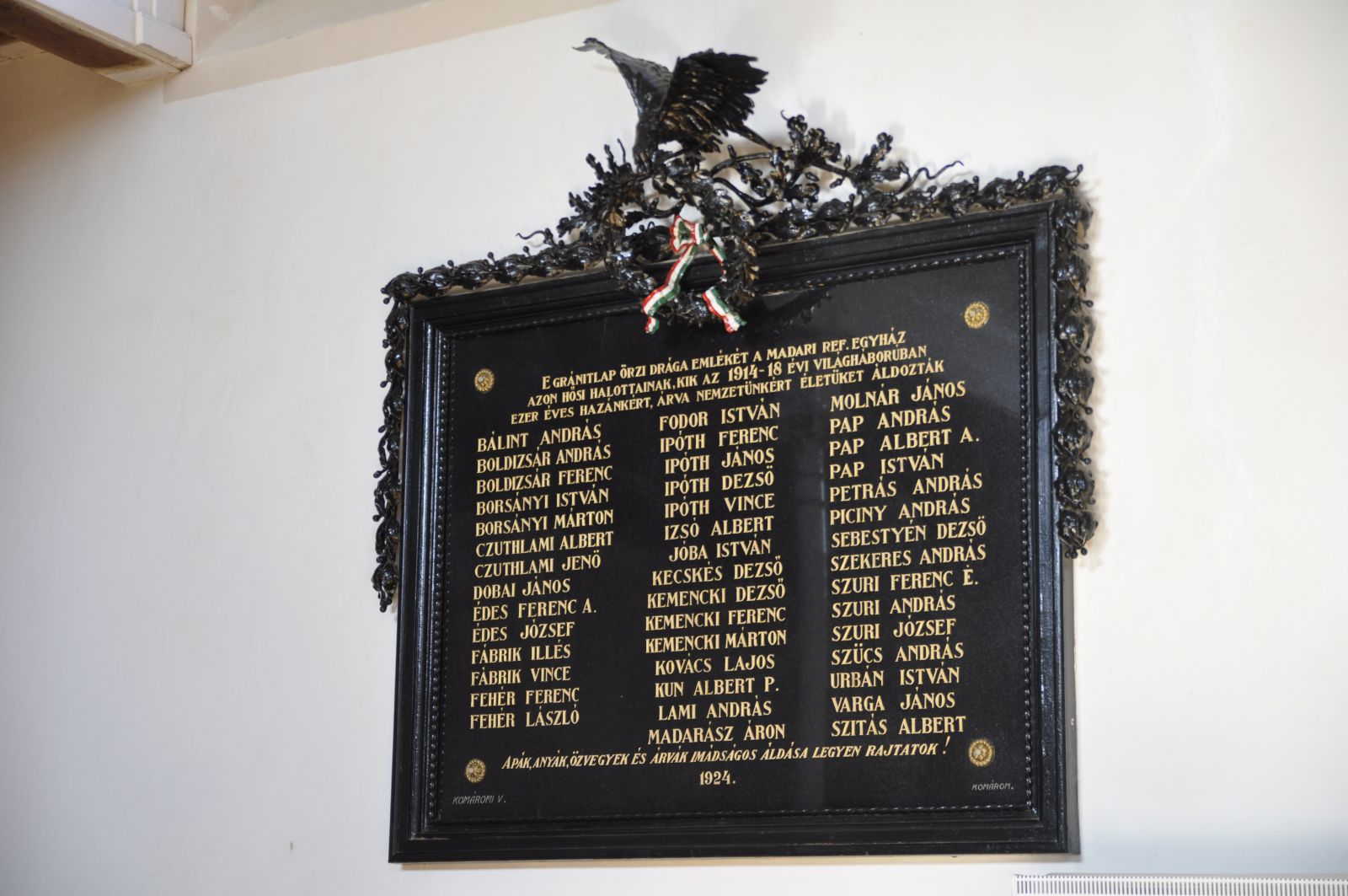 A madari ref. egyház azon hősi halottainak állíttatták 1924-ben, kik az 1914-18 évi világháborúban ezer éves hazánkért, árva nemzetünkért életüket áldozták.