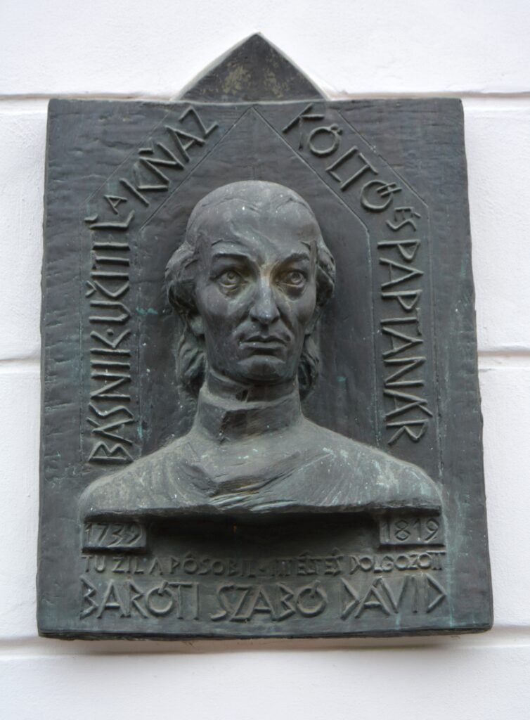 A barokk stílusú épület, melyen a domborműves emléktáblát 1995-ben elhelyezték, egykor a jezsuiták kolostora volt. Itt, ebben az épületben tanított Baróti Szabó Dávid. Itt alapították meg Kazinczy Ferenccel és Batsányi Jánossal együtt a „Magyar Museum” című folyóiratot.
