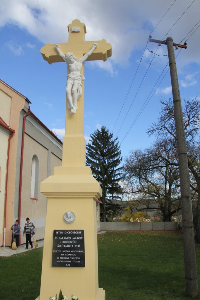 A templom kertjében áll, a bejárathoz képest a jobb oldalon. A felújitott sárga kőkereszten fehér kő Krisztus függ. Feje fölött fehér INRI felirat látható. Talapzatán Fehér Mária fej dombormű látható, alatta felirat fekete táblán.