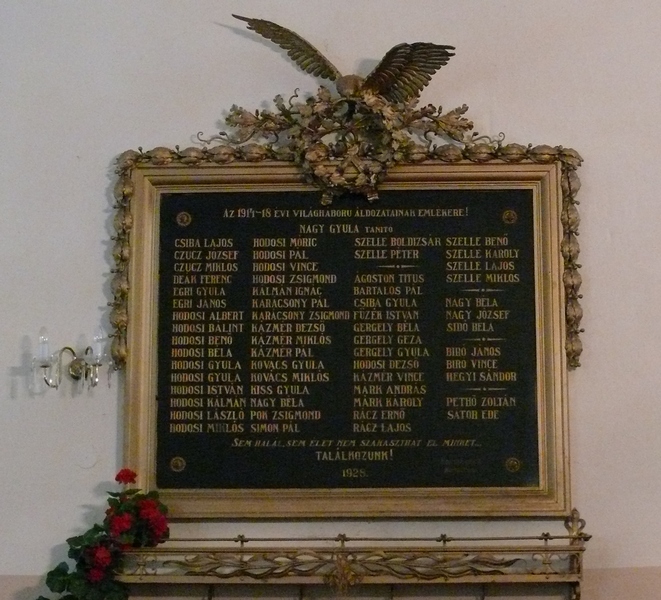 Első világháborús emlékmű a nemeshodosi templomban (szobor, emlékmű, emléktábla) (Nemeshodos, Hodos [Vydrany])