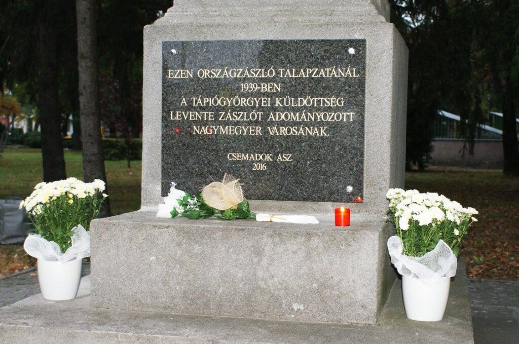 A nagymegyeri országzászló avatás története szorosan kapcsolódik Nagymegyer és Tápiógyörgye baráti kapcsolatainak kialakulásához. Tápiógyörgyén az elöljáróság már 1938. december 2-án foglalkozott az országzászló ajándékozásával, amit Nagymegyernek szántak. Ez végül nem valósult meg, mert az 1938 1939-es év fordulóján a Kelenvölgyi Kaszinó testülete megkereste a nagymegyerieket felajánlásával, akik ezt elfogadták. Az országzászló ünnepélyes felavatására 1939. június 4-én került sor Nagymegyeren. Két nappal az Országzászló felhúzása után, 1939. június 6-án, a nagymegyeriek személyesen üdvözölhették a tápiógyörgyei leventék küldöttségét, akik a Nagymegyeri Levente Szervezetnek elhozták az általuk készített levente zászlót. A küldöttségnek 12 levente és 3 kísérő volt a tagja, akiket nagymegyeriek szívélyesen fogadtak és családoknál szállásoltak el.