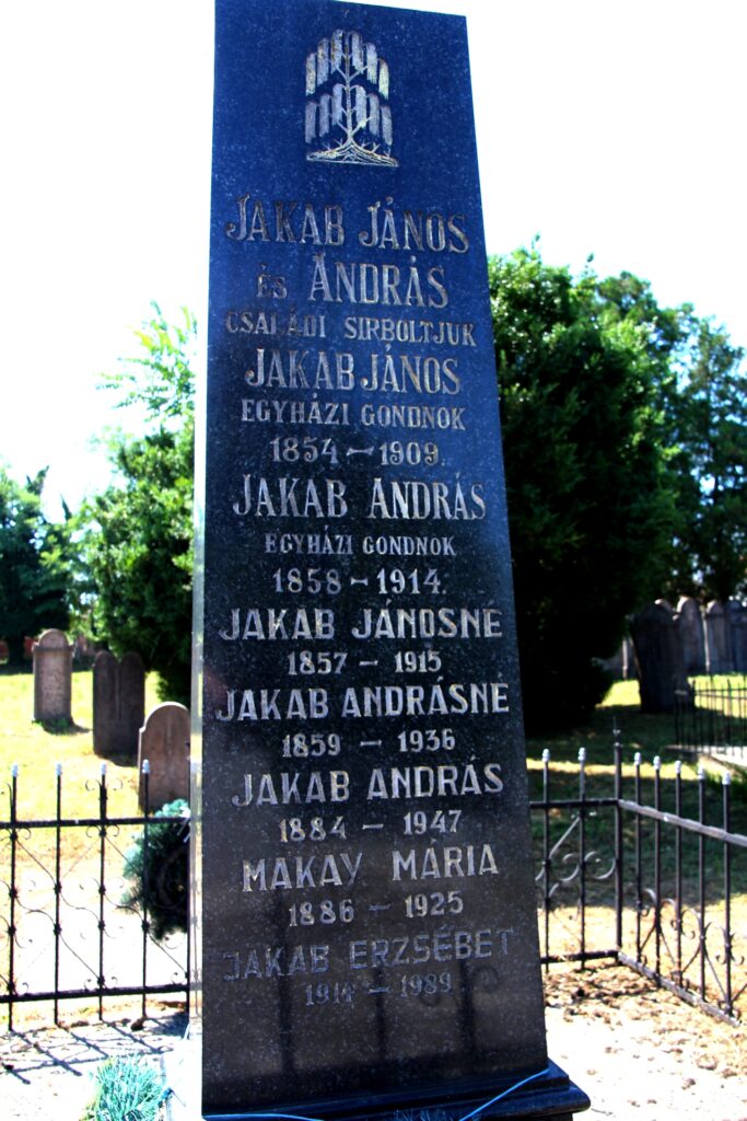 | Felirat | JAKAB JÁNOS / ÉS ANDRÁS / CSALÁDI SIRBOLTJUK / JAKAB JÁNOS / EGYHÁZI GONDNOK / 1854 - 1909. / JAKAB ANDRÁS / EGYHÁZI GONDNOK / 1858 - 1914. / JAKAB JÁNOSNÉ / 1857 – 1915 / JAKAB ANDRÁSNÉ / 1859 – 1936 / JAKAB ANDRÁS / 1884 – 1947 / MAKAY MÁRIA / 1886 – 1925 / JAKAB ERZSÉBET / 1914 – 1989 // Siratják Özvegyeik / SZENCZI ERZSÉBET és ZSUZSANNA / hat gyermekeivel / BÉKE HAMVAIKRA! // Fellner. / É-ujvár. |