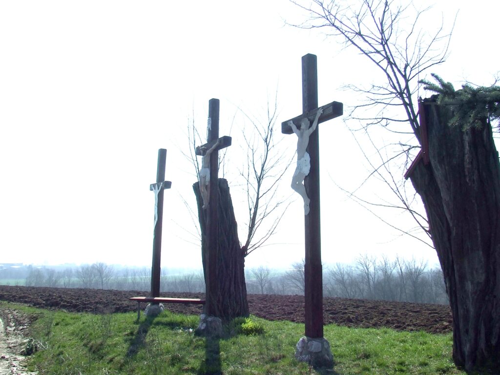 A plébániai alapítólevelekben egyek közt olvashatunk arról, hogy Lipthay Julianna, a neves szécsénkei család tagja az 1797. aug. 12-én kelt végrendeletében 50 forintot hagyott a szécsénkei kálváriának rendben tartására. A második világháború után… bozót nőtte be. Néhány éve az önkormányzat támogatásával kitisztították a három kereszt környékét, s a faluból elszármazott Deák László vállalkozó felújította Krisztus és a két lator keresztjét. Az egyenes szárvégű barnás fakeresztek így tovább őrzik e hely emlékét.