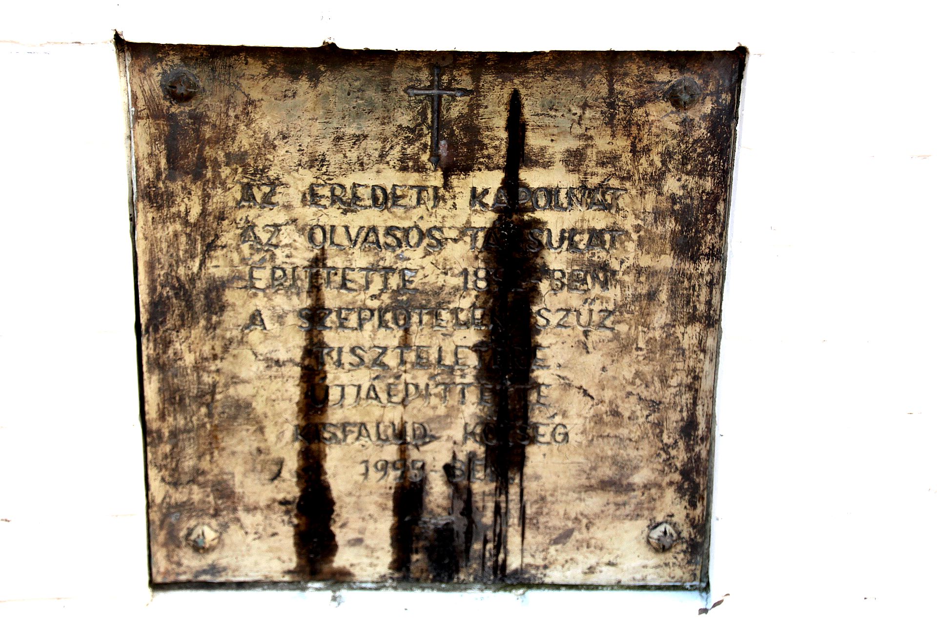 | Felirat | AZ EREDETI KÁPOLNÁT / AZ OLVASÓS TÁRSULAT / ÉPÍTTETTE 1852-BEN / A SZEPLŐTELEN SZŰZ / TISZTELETÉRE / ÚJJÁÉPÍTTETTE / KISFALUD KÖZSÉG / 1995-BEN |